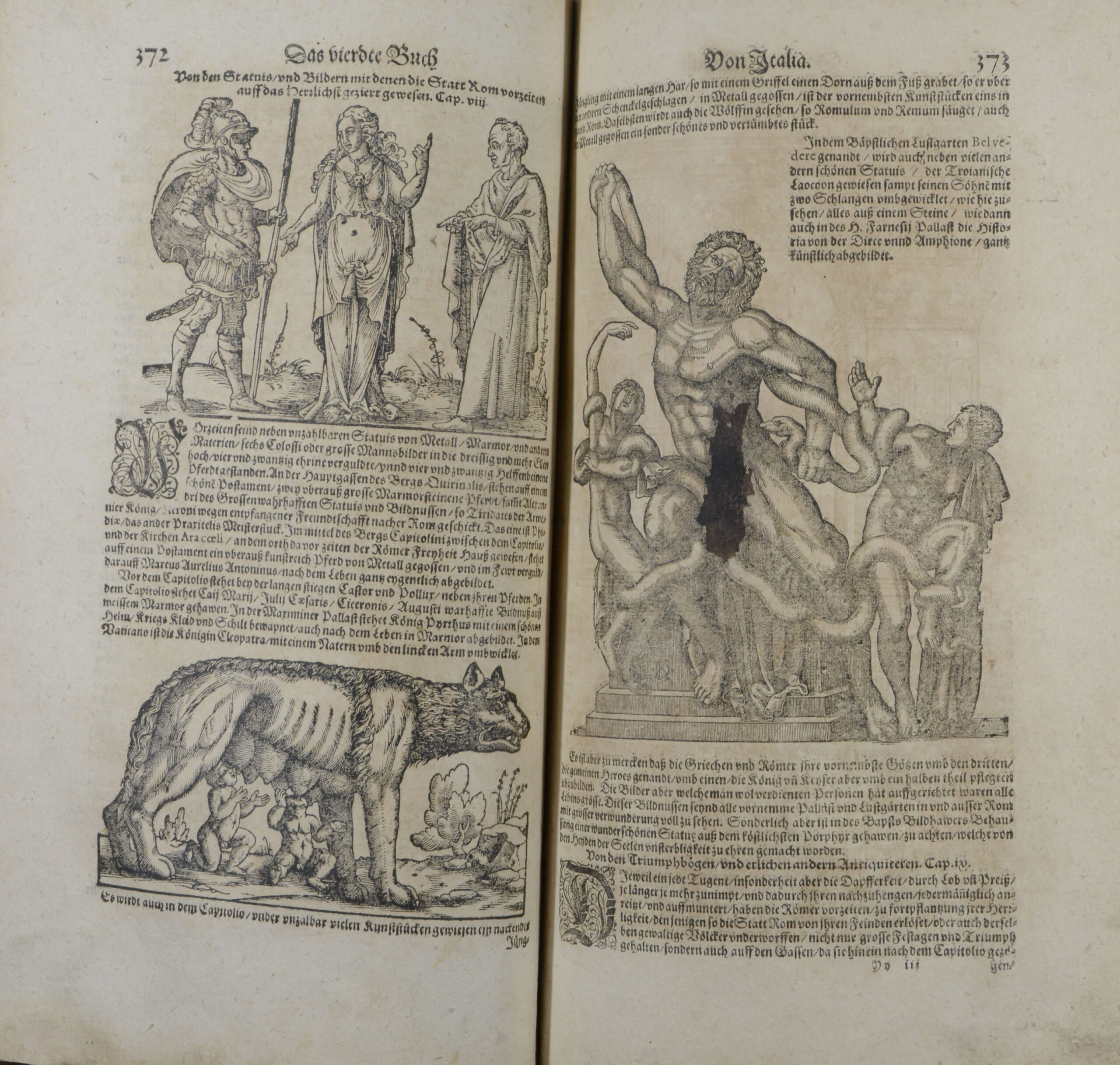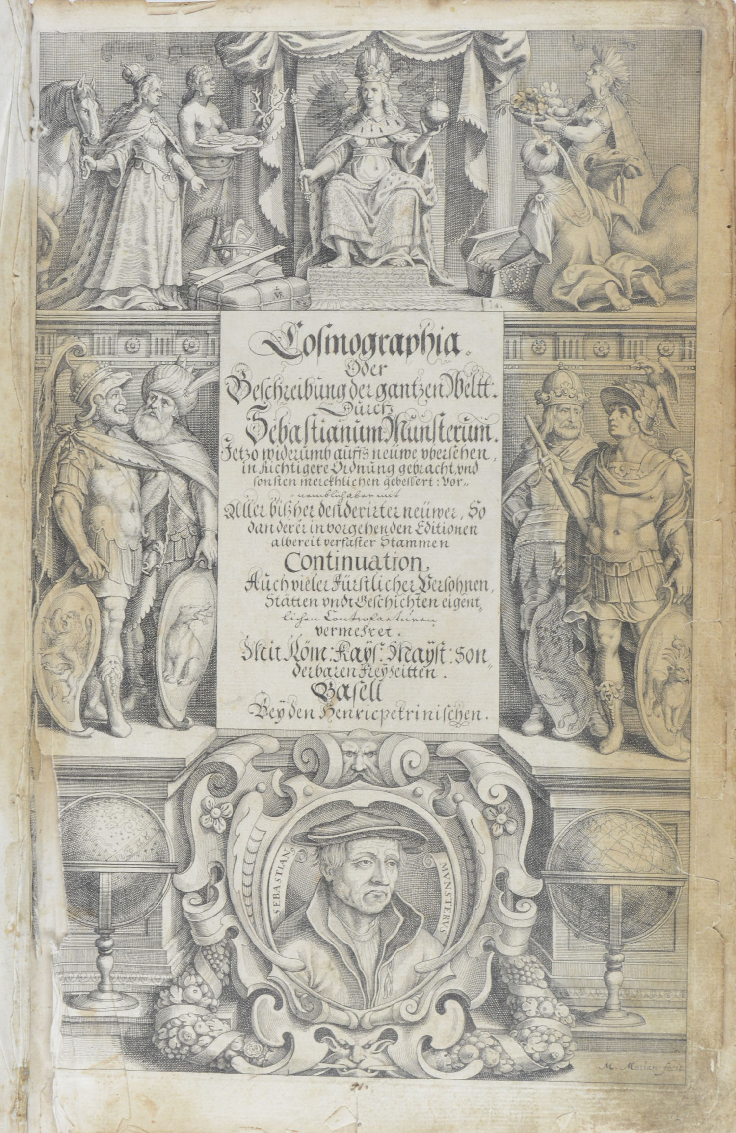 Burmeister 86; VD 17, 23:230709C; Sabin 51396. – Die berühmte Weltbeschreibung in der letzten und umfangreichsten deutschen Ausgabe, gegenüber der voherigen nochmals um 200 Holzschnitte erweitert. – Von den 26 Vortextkarten wurden 25 neu gezeichnet. In unserem Exemplar sind eine (von 2) Weltkarten (es die erste Generalkarte), die Karten von Europa, Asien, Afrika, (Amerika fehlt), 5 (von 6) Karten Deutschlands (es fehlt die 2. Rheinlaufkarte) und die Karten der europäischen Länder vorhanden. – Die Ansichten zeigen Augsburg, Basel, Bern, Bordeaux, Colmar, Eger, Erfurt, Florenz, Frankfurt am Main, Freiburg, Freising, Fulda, Genf, Jerusalem, Kairo Koblenz, Köln, Konstantinopel, Lindau, Meissen, Paris, Simmern, Speyer, Stettin, Straßburg, Rom, Trier, Verona, Worms, Würzburg, Zürich u. a. – Es fehlen die Ansichten von Venedig und die Meerwundertafel. Die große mehrfach gefaltete Ansicht von Heidelberg liegt lose aus einem anderen Exemplar bei. – Gestochenes Frontispiz lose und mit Randläsuren mit etwas Bildverlust, teils stärker braun- bzw. fingerfleckig, Illustration auf Seite 365 und 373 mit geschwärzter Stelle. Die Heidelbergansicht mit kleineren Randeinrissen. Die ersten Blatt mit kleineren Papierausbrühen am Rand. Beiliegend: Amerikakarte in kleinerem Format aus einer früheren Ausgabe.