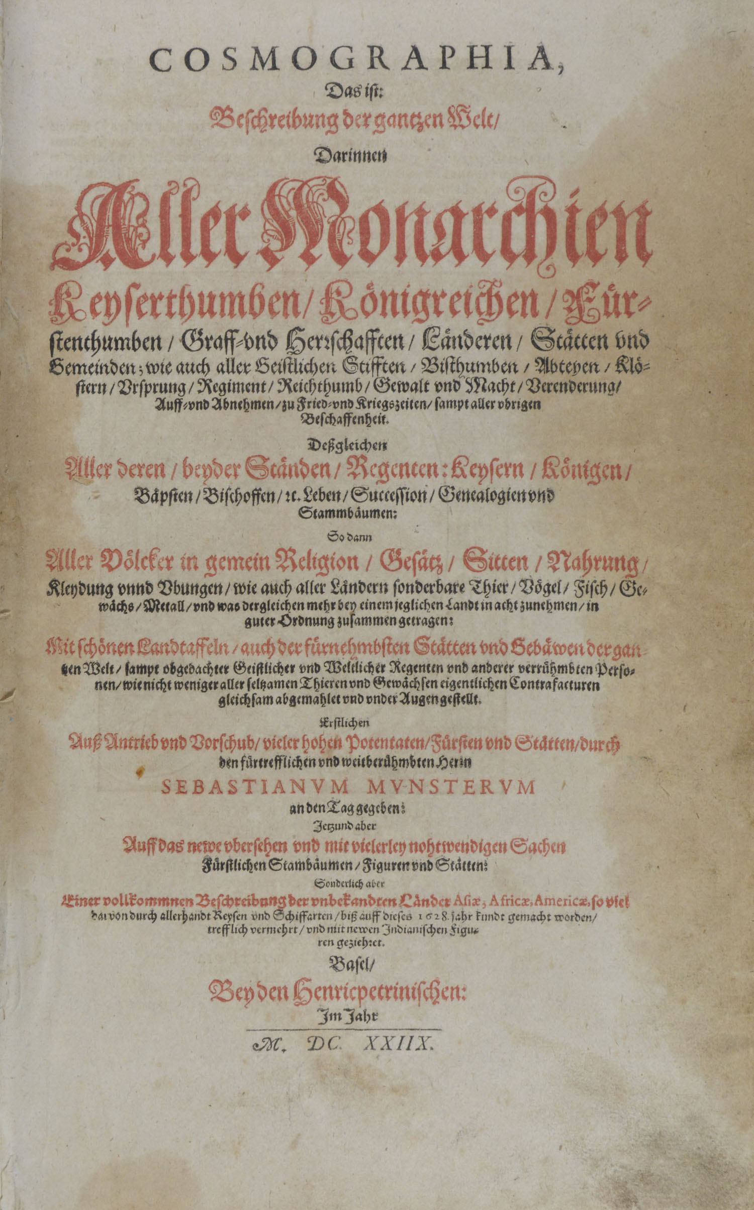 MÜNSTER, Sebastian. Cosmographia, Das ist: Beschreibung der gantzen Welt, darinnen aller Monarchien, Keyserthumben, Königreichen…Länderen, Stätten und Gemeinden… Beschaffenheit.