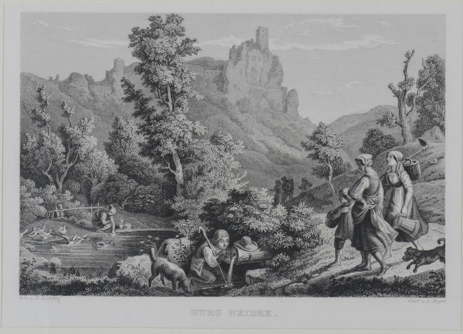 NEIDECK/Franken. Ansicht mit der Burg. 1840. Stahlstich von Beyer nach Ludwig Richter, 11×16.