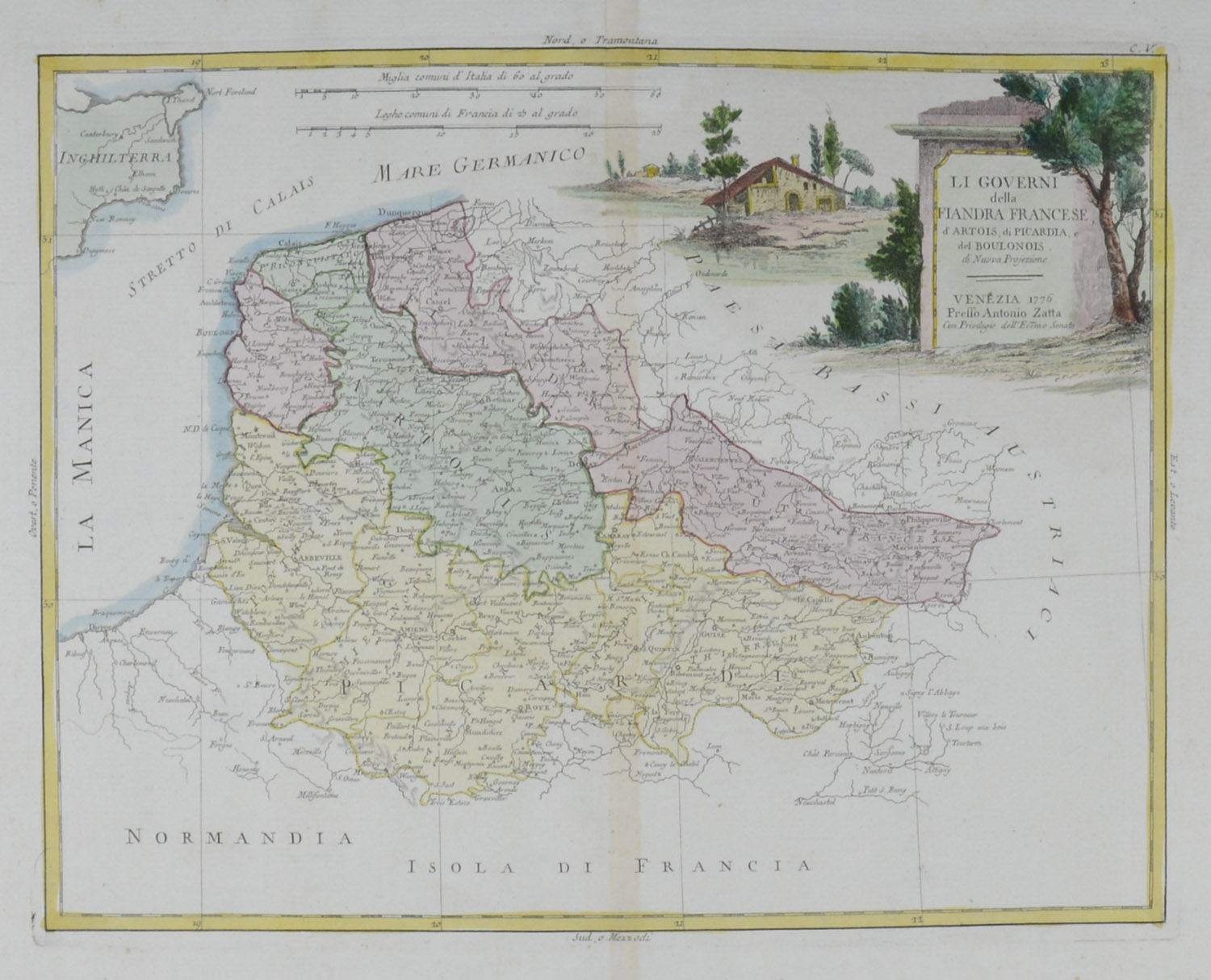 NORDFRANKREICH – „Li Governi della Fiandra Francese, d’Artois, di Picardia, e del Boulonois di nuova Projezione“. Karte mit Dunquerque und ein Stück von England im Nordwesten; Gournay sur Aronde im Süden. Venezia, 1776. Altkolorierte Kupferstich-Karte von Antonio Zatta, 36,5×29. Bugfalte.