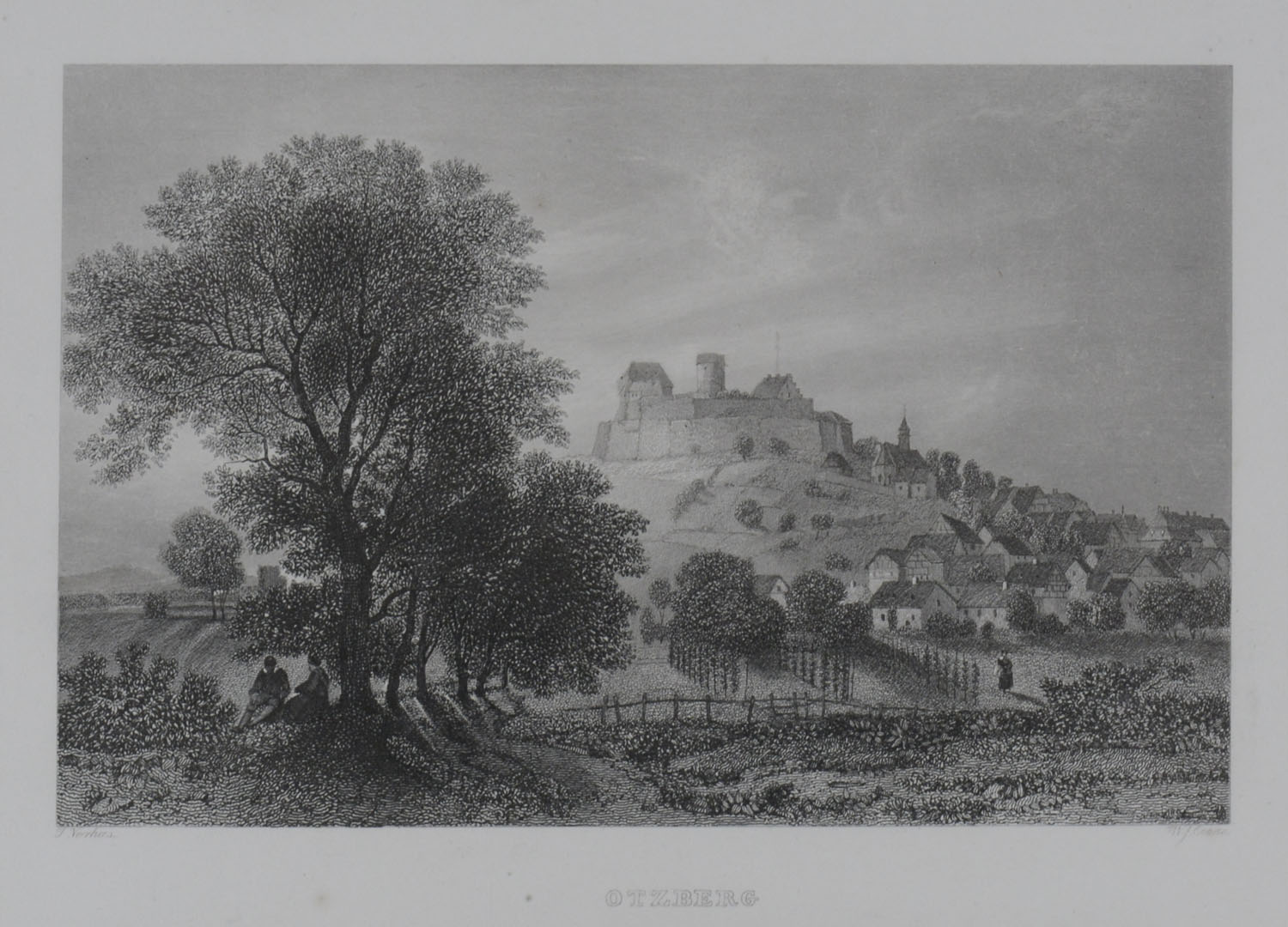 OTZBERG/Odenwald. Gesamtansicht mit Burg. 1843. Stahlstich von Cooke nach Verhas, 10×15.