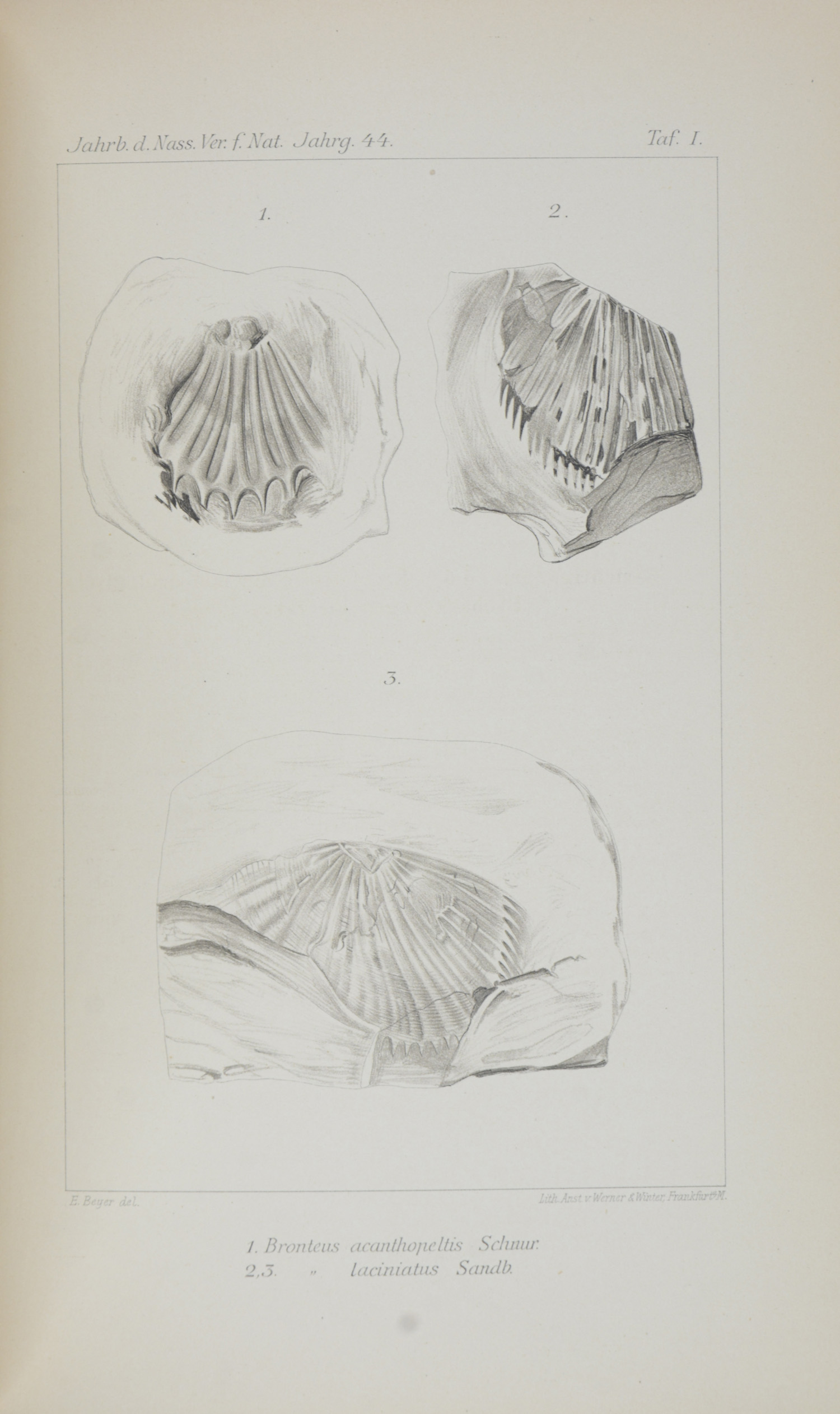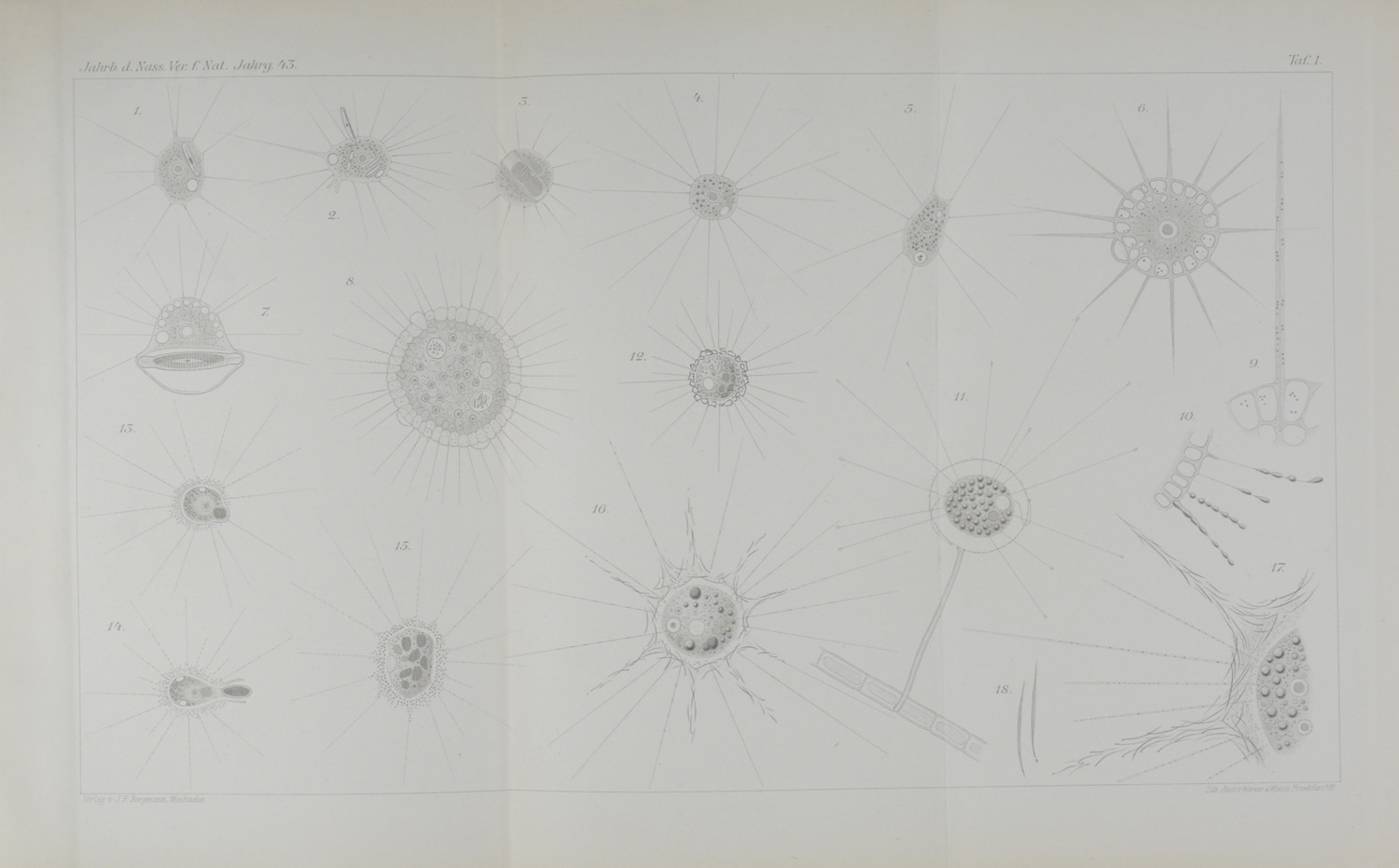 PAGENSTECHER, Arnold (Hrsg.). Jahrbücher des Nassauischen Vereins für Naturkunde. Jahrgänge 41-45. Wiesbaden, Bergmann, 1888-1892. 5 Bände. Gross-8°. Mit 11 (davon 2 gefalteten) lithographischen Tafeln und einigen Abbildungen im Text. Originalbroschuren mit Rücken- und Deckeltitel, (etwas angestaubt, Umschläge mit kleinen Randläsuren).