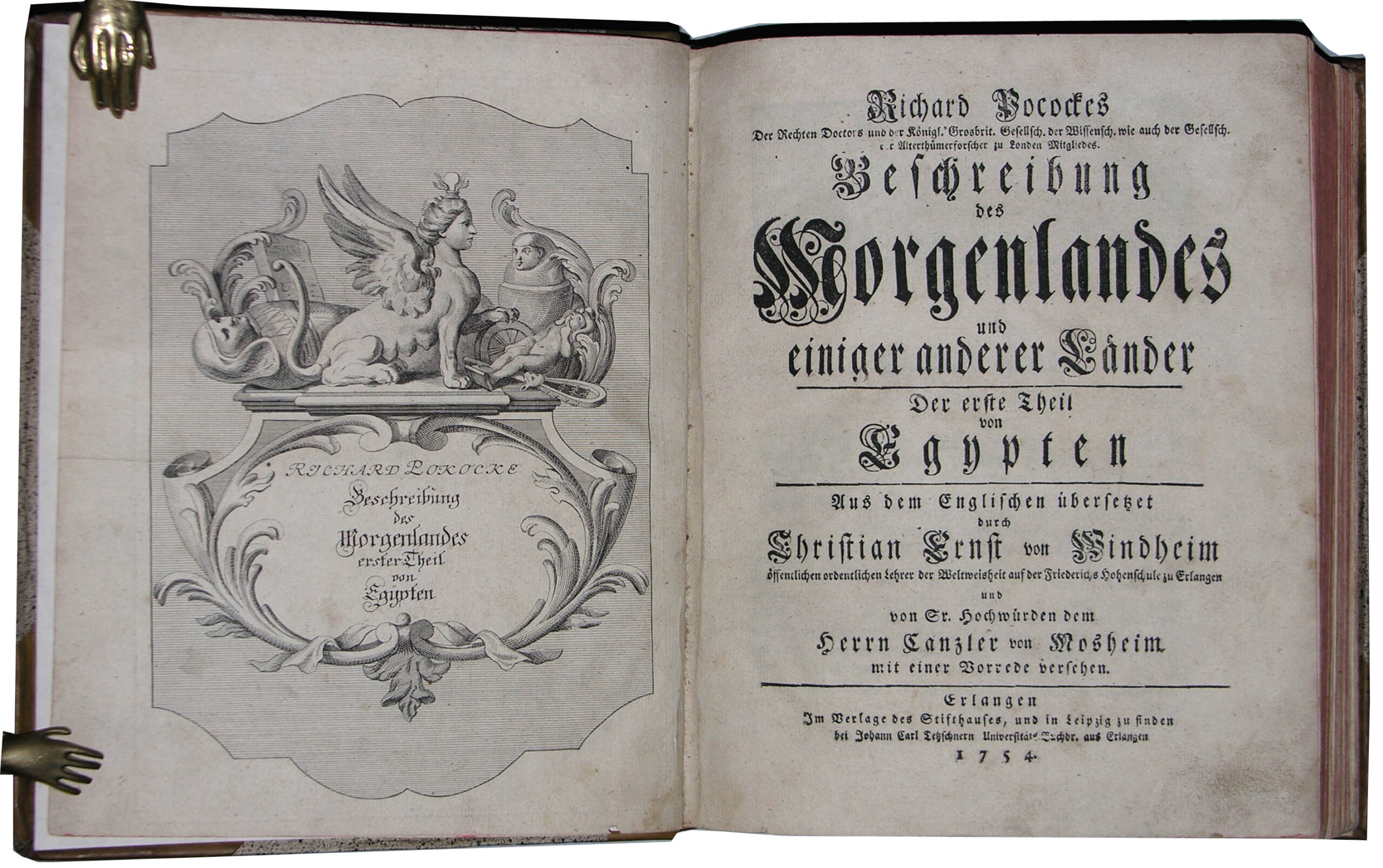 POCOCKE, Richard. Beschreibung des Morgenlandes und einiger anderer Länder. Aus dem Englischen übersetzet durch Christian Ernst von Windheim und von… Herrn Canzler von Mosheim mit einer Vorrede versehen. Erlangen, Verlag des Stiftshauses, Leipzig, Tetzschner, 1754-1755. 3 Bände. 4°. Mit 3 gestochenen Titeln und 173 von 180 gestochenen und gefalteten Kupfertafeln und Karten. Halbleder im Stil der Zeit mit Rückenschildern und Rückenvergoldung.