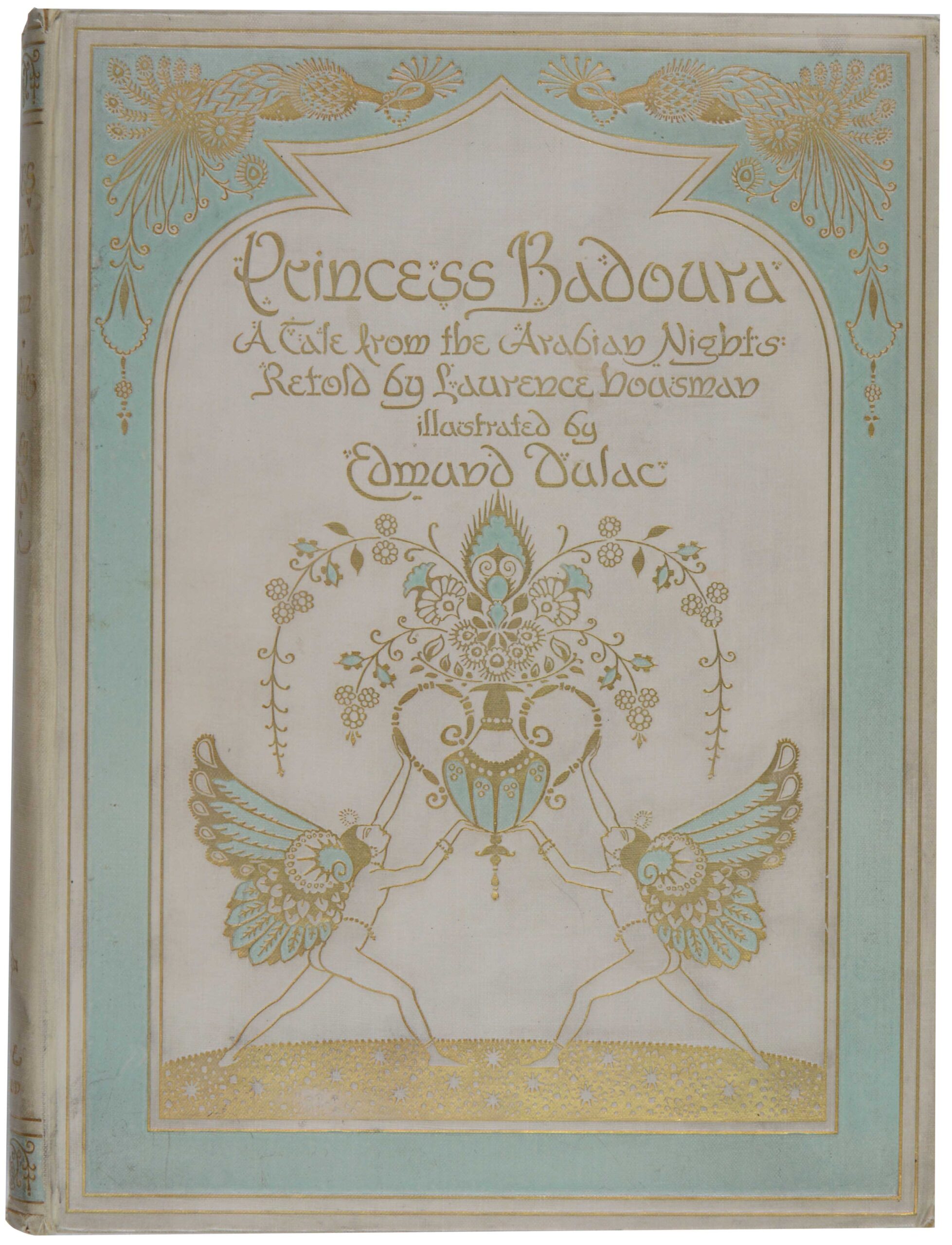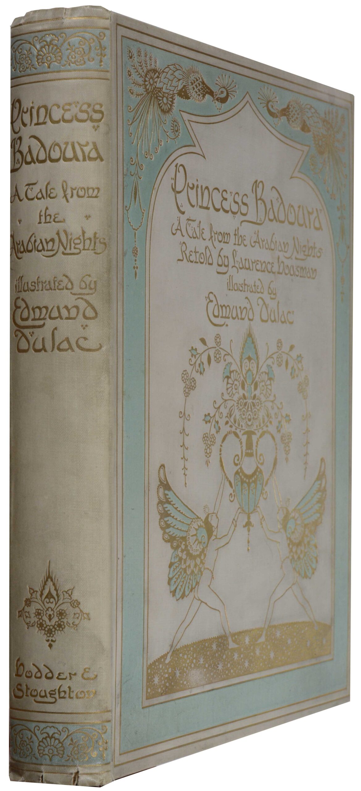 DULAC – Princess Badoura. A tale from the Arabian Nights retold by Laurence Hausman. (London), Hodder and Stoughton, o.J. (1913). 4°. 3 nn. Bl., 113 S., mit 10 montierten farbigen Tafeln von Admund Dulac. Originalleinen mit goldgeprägter Deckelillustration sowie Rücken- und Deckeltitel, (gering beschabt, etwas angeschmutzt).