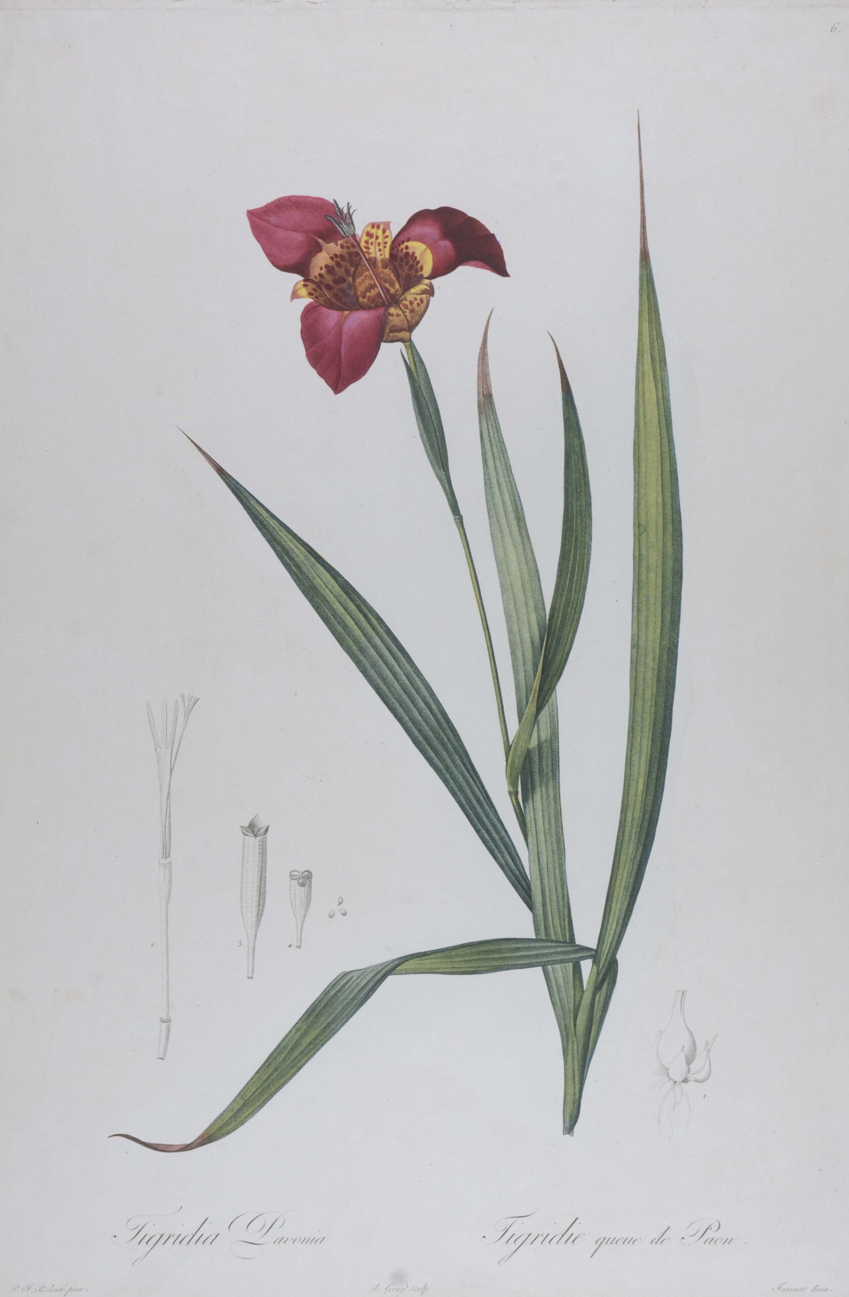 REDOUTÉ, Pierre Joseph. Tigridia Pavonia – Tigridie queue de paon. Darstellung einer Tigerblume oder Tigerlilie mit Fruchständen. Paris, um 1810. Beikolorierter Farbpunktierstich von Redouté nach Fassaert aus: „Les Liliacées“. 52,5, x 35,5. Bis an den Plattenrand beschnitten.