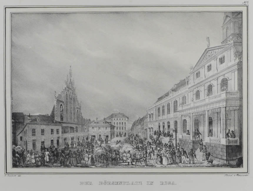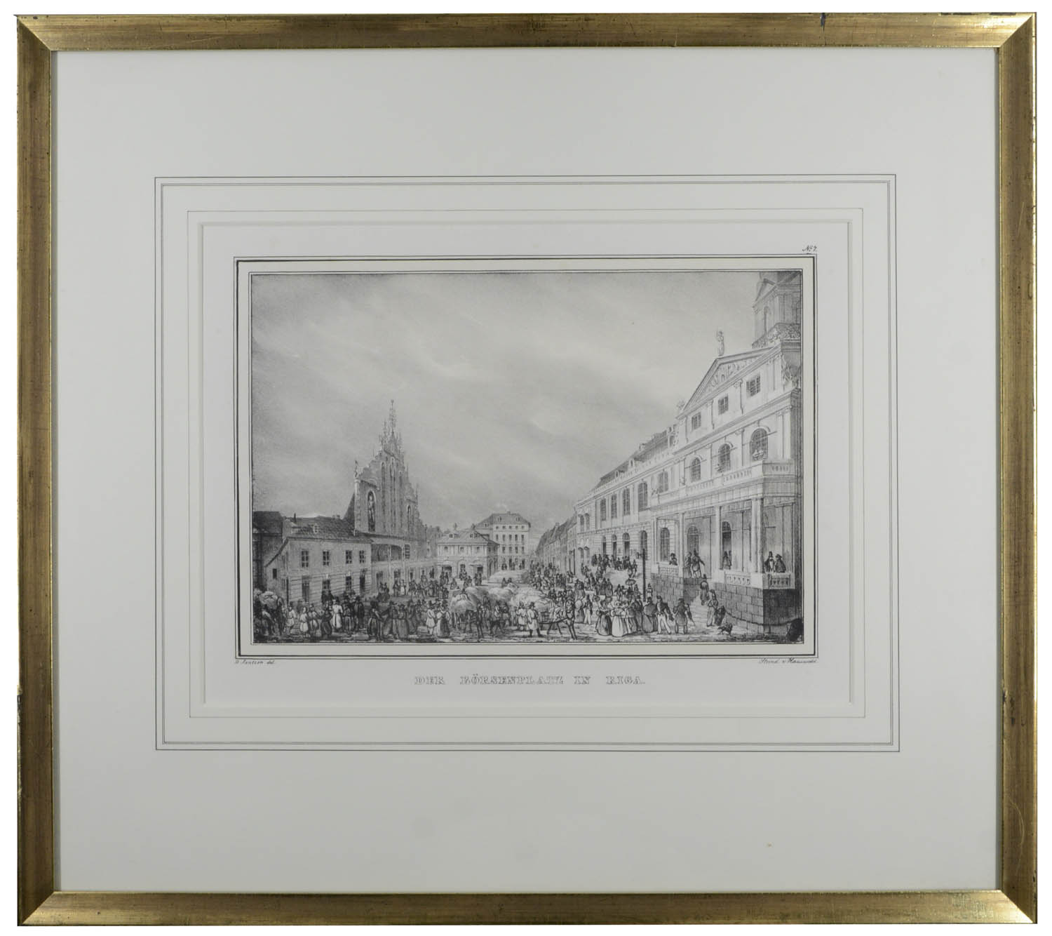 RIGA/Lettland. Der Börsenplatz. Teilansicht des Börsenplatzes mit dem Rathaus am rechten Bildrand. Um 1850.. Lithographie von Hauswald nach Jantzen. 22,5 x 30. Gerahmt.