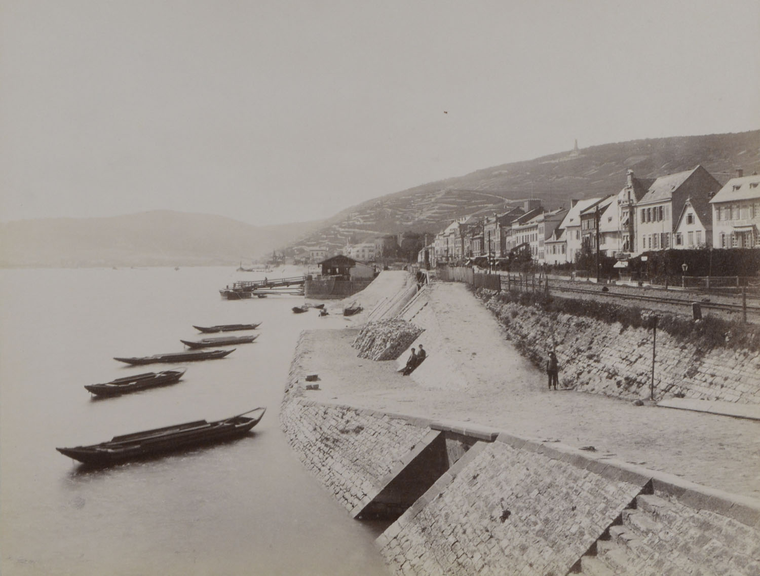 RÜDESHEIM. Ansicht von der Rheinseite mit Booten, im Hintergrund das Niederwalddenkmal. Um 1890. Originalfotografie. Albuminabzug. 20,7 x 26,3. Auf Karton montiert.