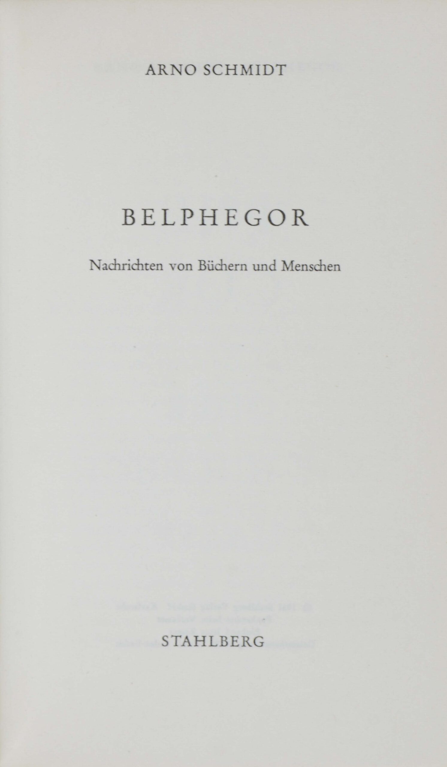 SCHMIDT, Arno. Belphegor. Nachrichten von Büchern und Menschen. Karlsruhe, Stahlberg, 1961. 8°. 453 S., 1 nn. Bl. Originalleinen mit Rücken- und Deckeltitel mit Originalschutzumschlag, (Umschlag mit kleineren Randeinrissen und minimalem Ausriss).