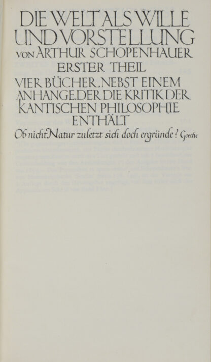 PHILOSOPHIE – SCHOPENHAUER, Arthur. Die Welt als Wille und Vorstellung. Leipzig, Insel-Verlag, (1905). 2 Bände. 8°. 1462 S., 1 nn. Bl. Originalleder mit goldgeprägtem Rücken- und Deckeltitel, (Rücken etwas verblasst).