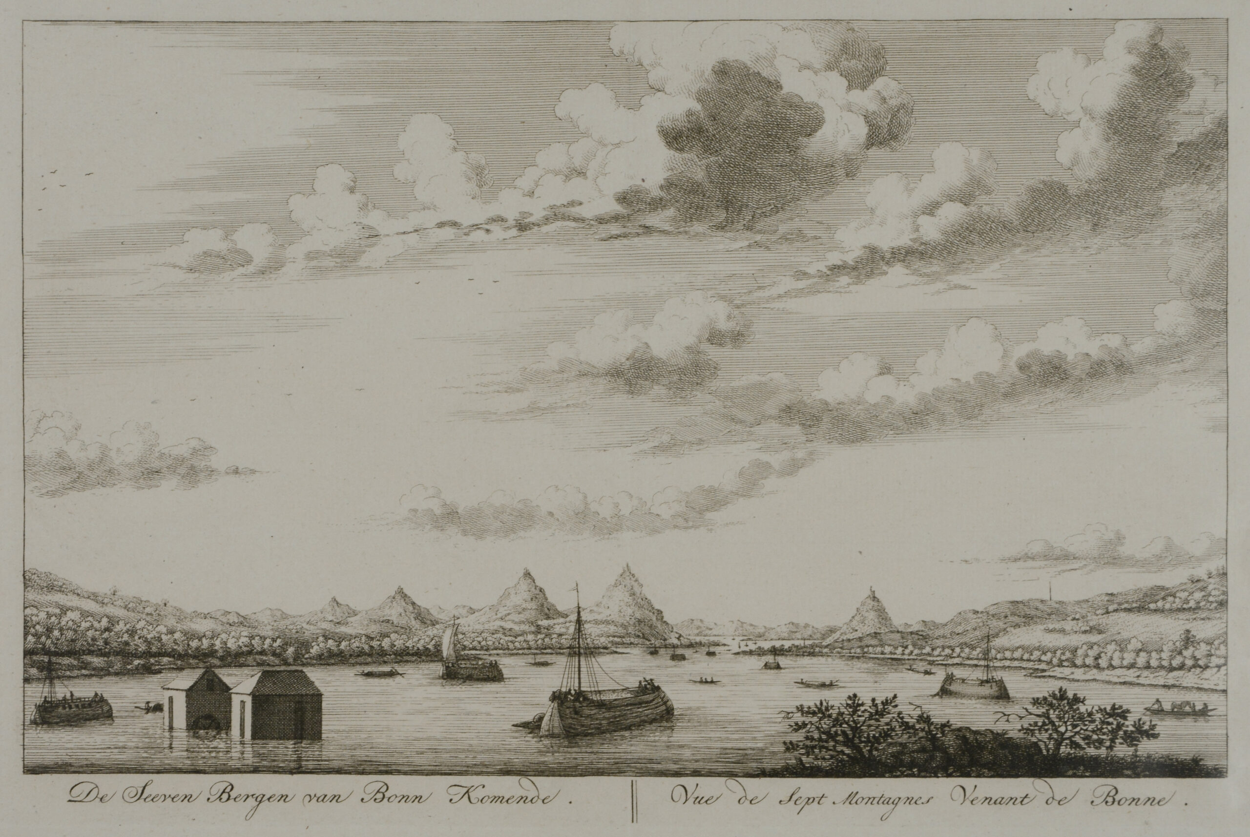 SIEBENGEBIRGE. De Seeven Bergen van Bonn Komende. Rheinlandschaft mit Blick auf das Siebengebirge und Schiffen. Amsterdam, 1794. Kupferstich aus Saakes: Beknopte Beschrijving van den Rhijnstroom. 20,6×32,5.