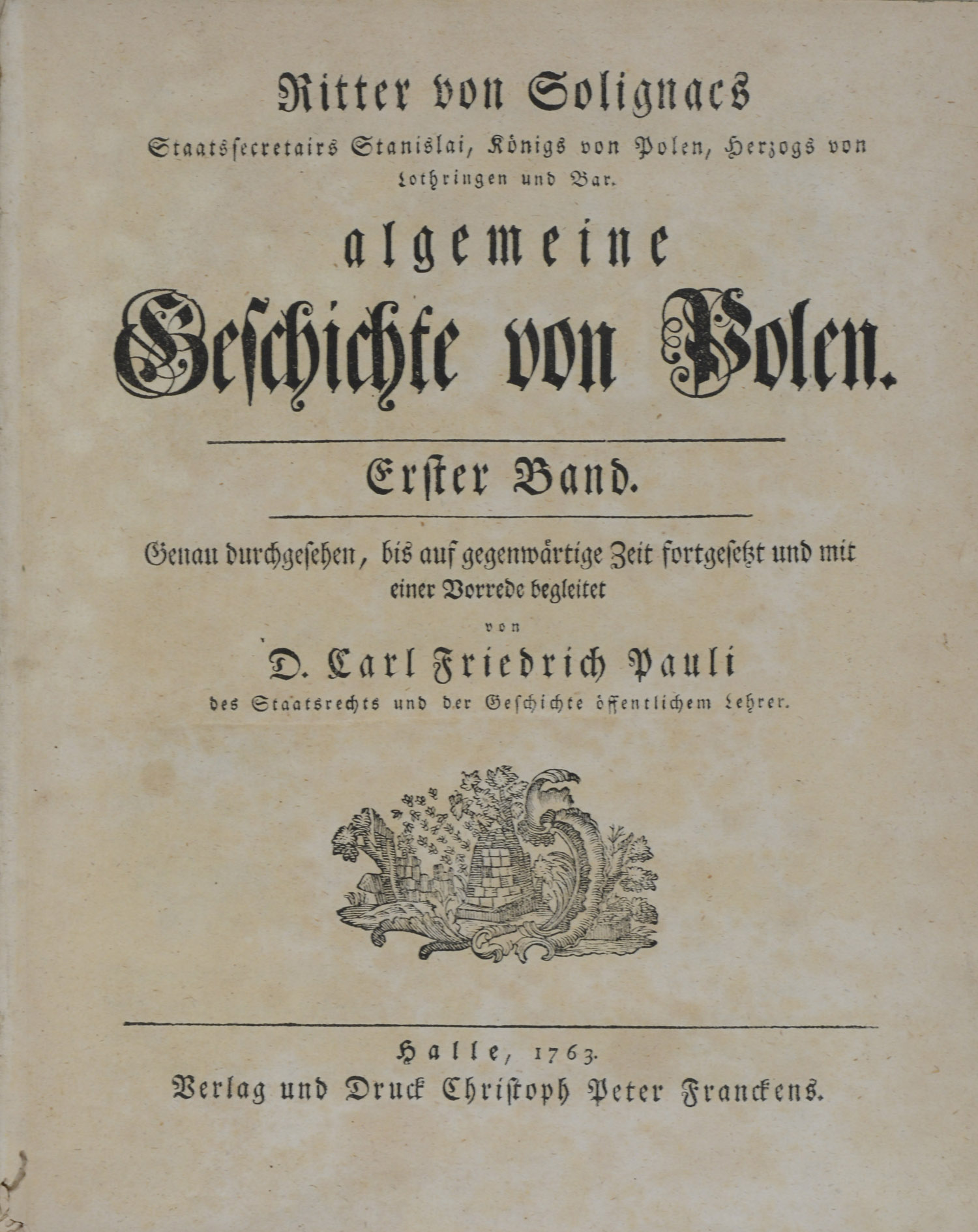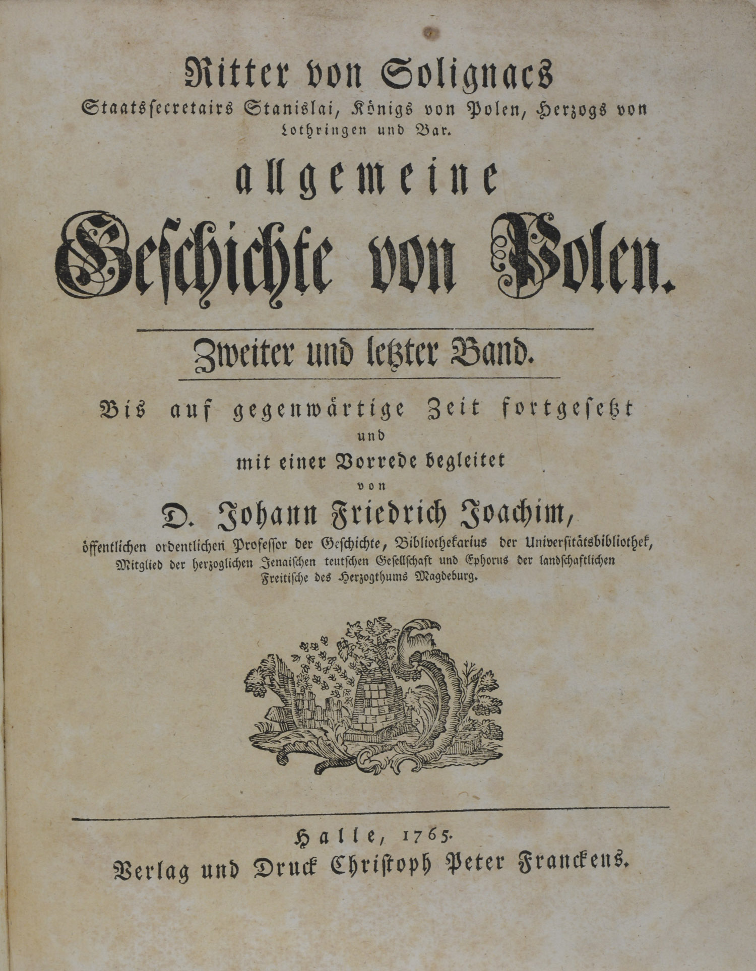 POLEN – SOLIGNAC, (Pierre-Jos. de la Pimpie).  Algemeine Geschichte von Polen. Genau durchgesehen, bis auf gegenwärtige Zeit fortgesetzt und mit einer Vorrede begleitet von Carl Friedrich Pauli (und) Johann Friedrich Joachim (im Band 2). Halle, Christoph Peter Francke, 1763. 2 Bände. 4°. 15 nn. Bl., 542 S., 8 nn. Bl.; 918 S., 6 nn. Bl. Schlichte Pappbände der Zeit mit Rückenschild, (berieben und bestoßen, teilweise fleckig).