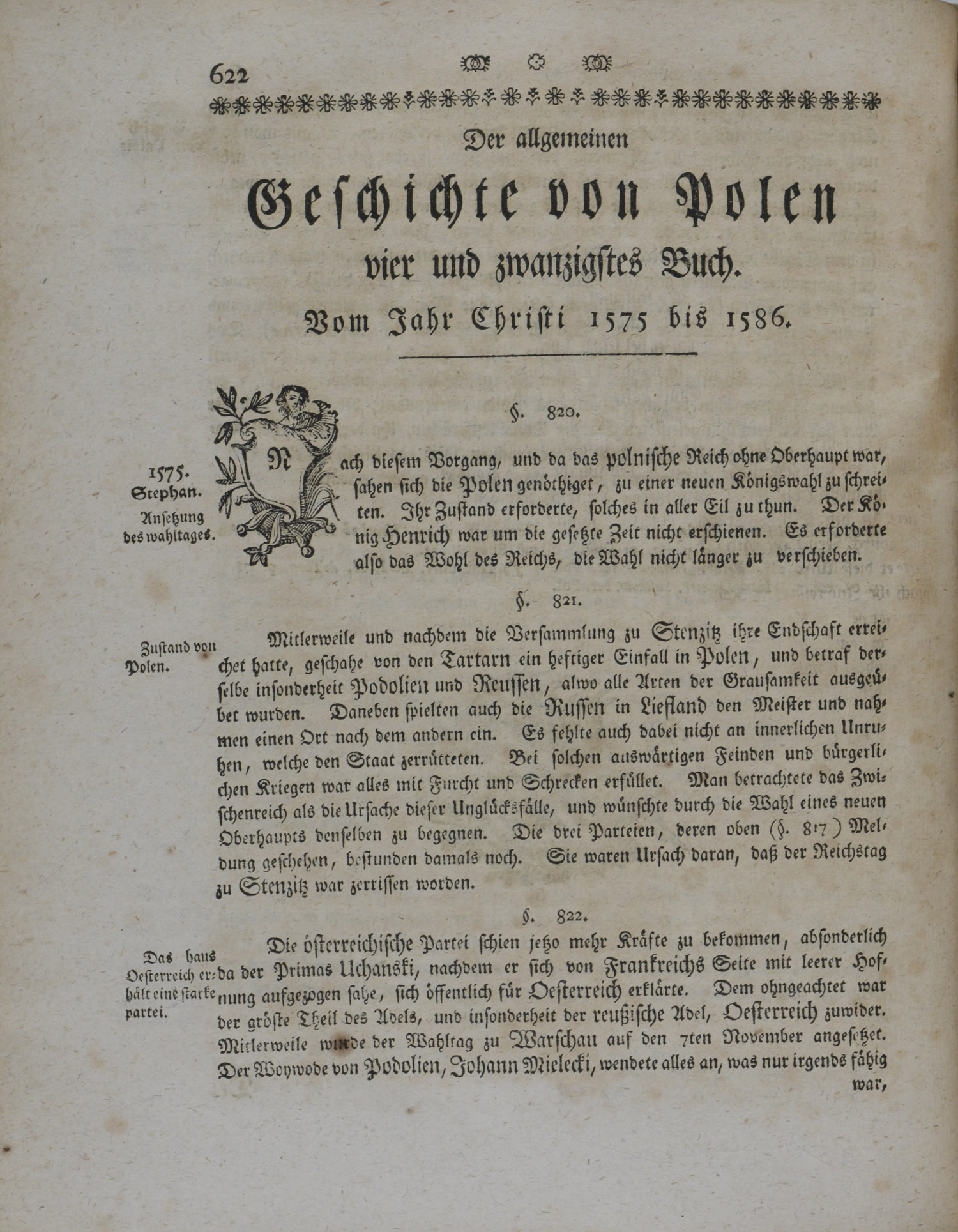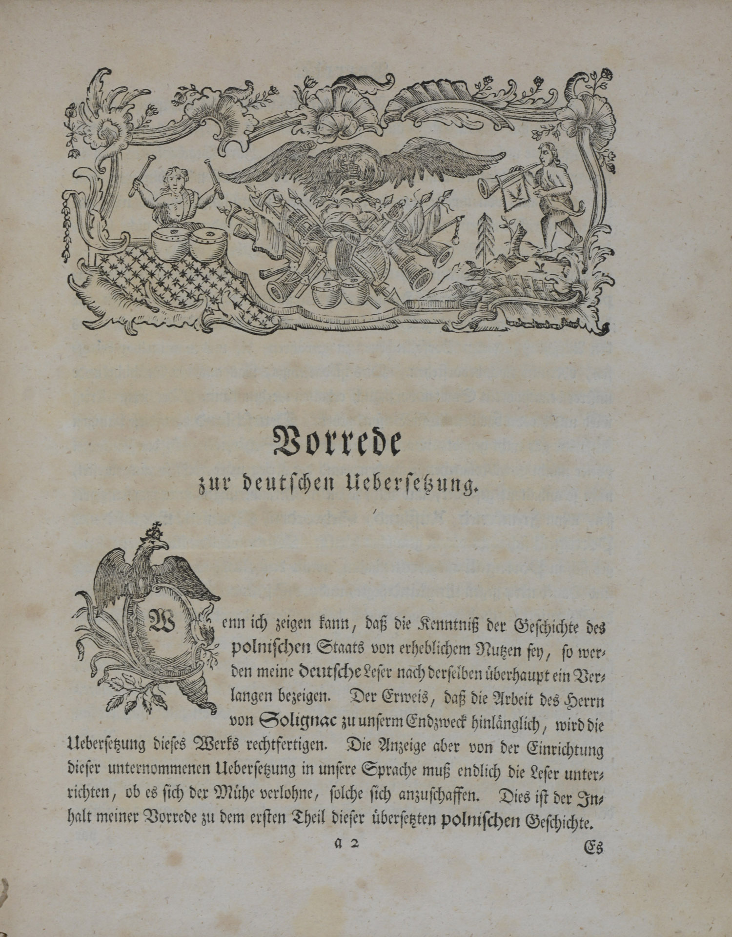 Erste deutsche Ausgabe. – Der Historiker Solignac (1687 – 1773) war Sekretär von König Stanislaus in Nancy und veröffentlichte 1750 eine 5-bändige Geschichte Polens auf Französisch, die jedoch nur die Geschichte bis 1575 umfasst. Die deutsche Ausgabe ist nicht so detailliert, dafür aber bis 1764 fortgeschrieben wurden. – Durchgehend etwas stockfleckig, leicht gelockert.