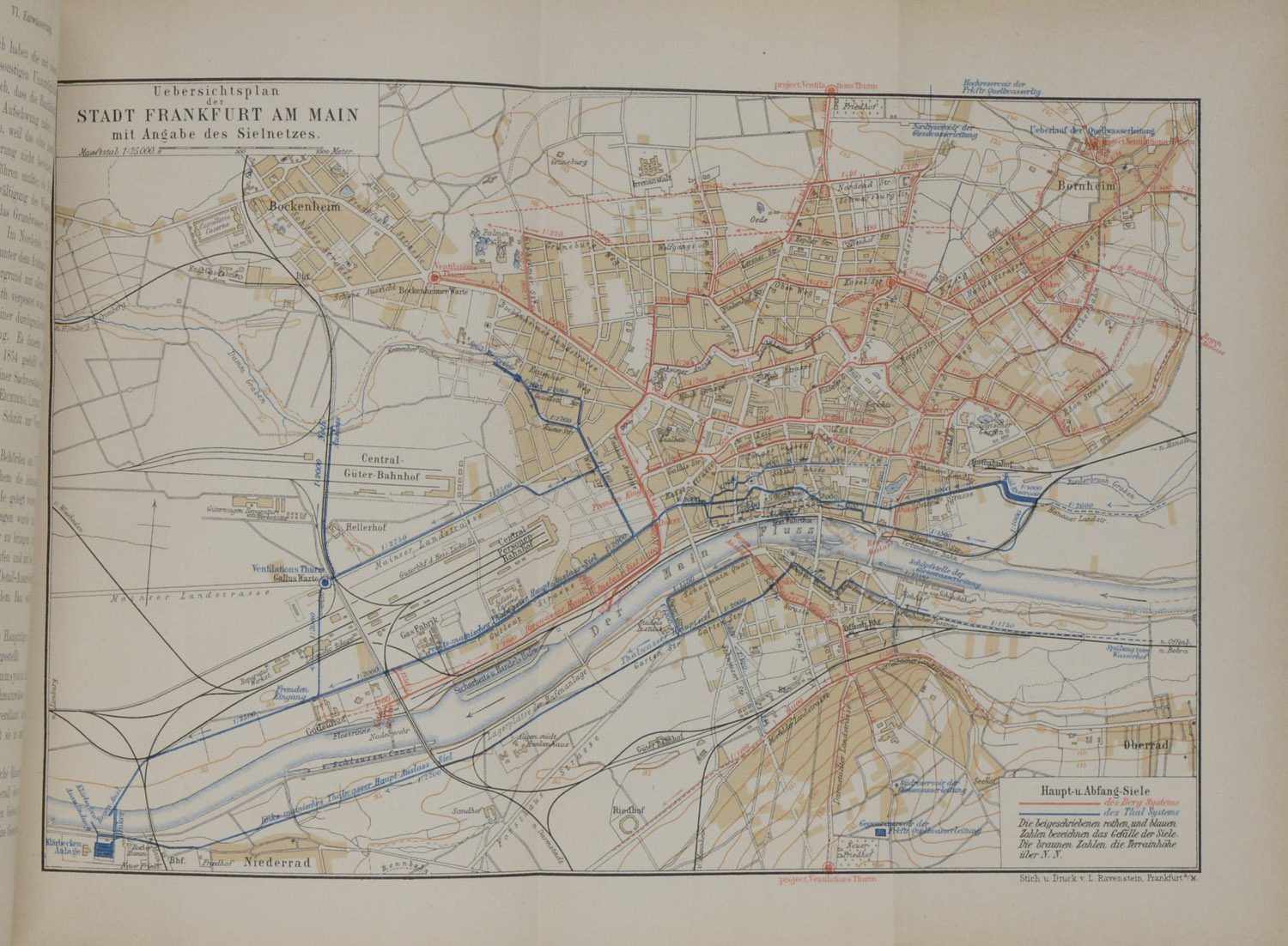 SPIESS.  Die hygienischen Einrichtungen von Frankfurt am Main. Mit Zugrundlegung der Herrn Dr. Varrentrapp im Jahre 1881 gewidmeten Festschrift… Bearbeitet unter Mitwirkung von Behnke und Lindley. Frankfurt, Mahlau, 1888. Gr.-8°. Portrait, 3 nn. Bl., 327 S., mit 1 Tafel, 1 gefalteten farbigen Plan und zahlreichen Textillustrationen. Originalleinen mit goldgeprägtem Rücken- und Deckeltitel, (leicht beschabt und leicht fleckig).