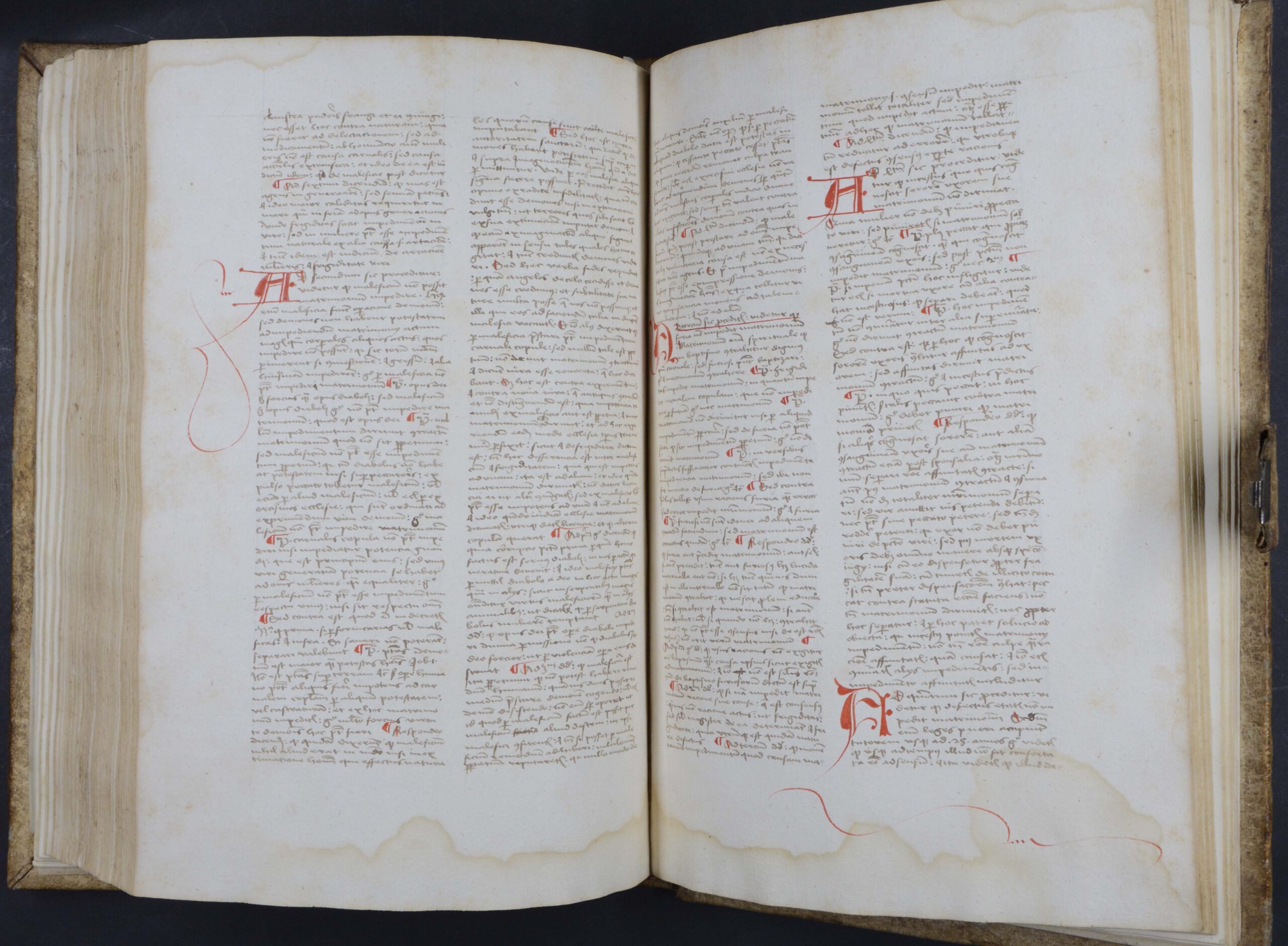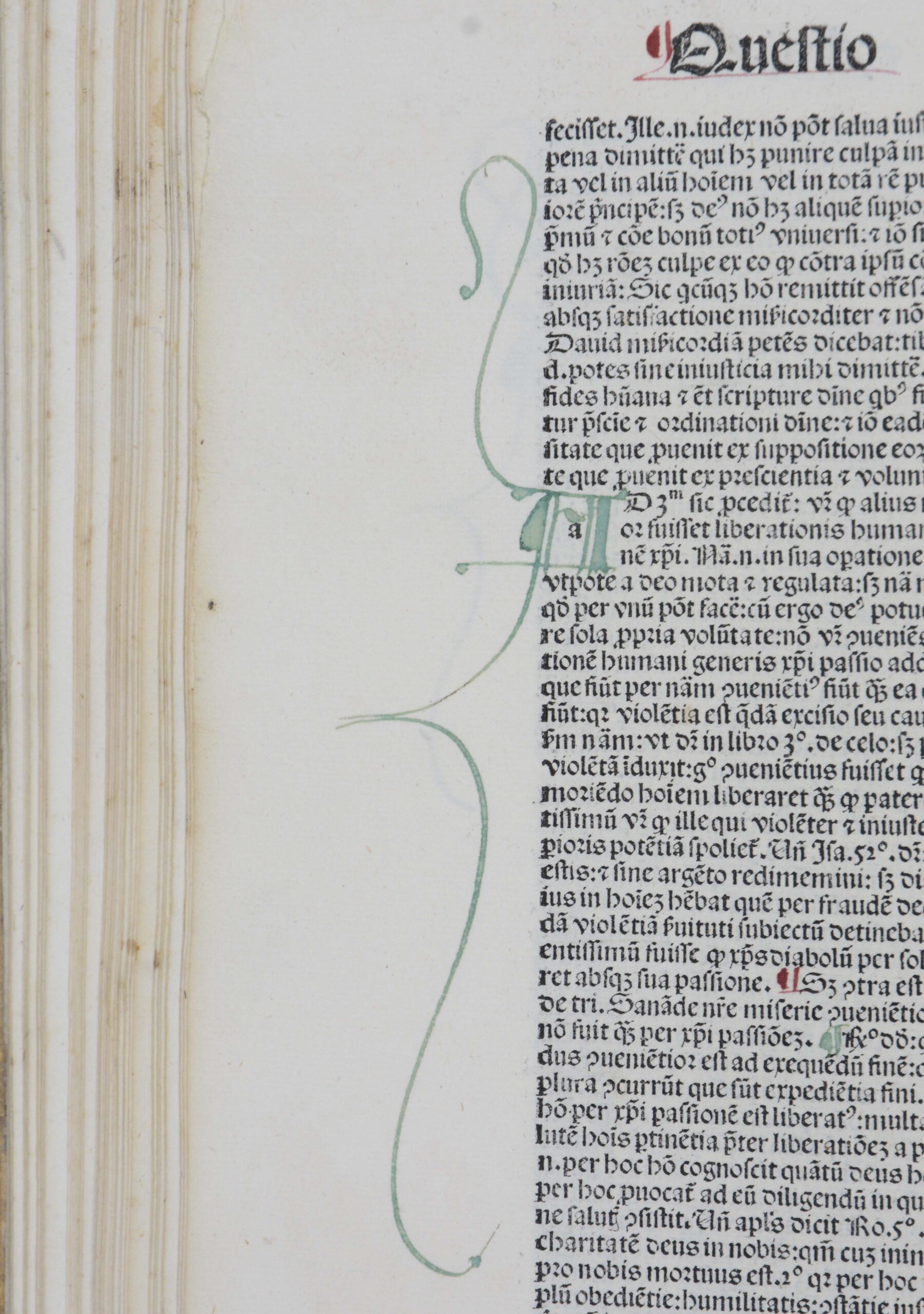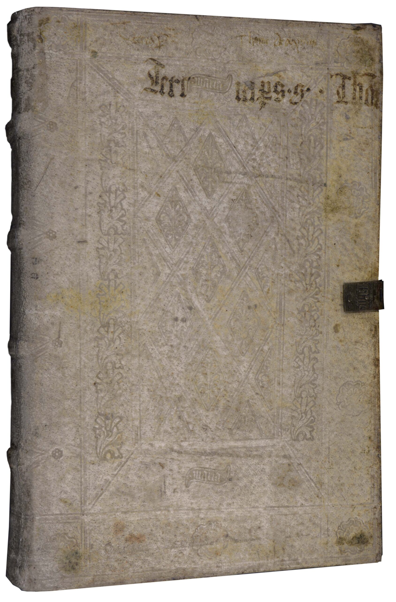 Goff T 222; HC 1470; BMC V, 364; Hain 1470; BSB-Ink T-298; Proctor 4826. – Fünfte Ausgabe insgesamt und zugleich dritte in Italien gedruckte. Der einzige bei Stagninus gedruckte Band der Aquin-Ausgabe in Venedig. – Zweispaltiger Druck in gotischer Type. – Mit zahlreichen eingemalten Initialen mit langen Ausläufern und Zierschwüngen, sowie Paragrafenmarken in Rot und Grün. – Die „Summa theologiae“ gilt als das Hauptwerk des bedeutenden Theologen und wurde vielfach als das wichtigste theologisch-philosophische Werk überhaupt bezeichnet. – Im dritten und letzten Teil werden die Person und das Werk Christi, die Sakramente und die letzten Dinge behandelt. Nach den Bußsakramenten bricht Thomas ab, es folgt dann das Supplementum, eine Ergänzung aus Thomas‘ früherem ‚Sentenzenkommentar‘ durch seinen Freund und Mitarbeiter Reginald von Privorno. Die vorliegende Ausgabe ist ein Nachdruck der Edition von Johann Manthen, Köln 1478, in der die Supplemente erstmals mitgedruckt wurden. Laut BMC wurden die Drucktypen nur für diese Ausgabe verwendet. – Fliegende Pergamentvorsätze. – Die beiden fehlenden Textblätter ff4 und ff5 wurden von zeitgenössischer Hand ergänzt und rubriziert. Mit einem Kronenwasserzeichen, vermutlich Piccard I, XII, 25 süddeutsch. – Mit einem handschriftlichen zeitgenössischen Besitzeintrag auf dem Pergamentvorsatz (Pangratius Huczelma(n)). – Der sehr schöne, intakte zeitgenössische Einband stammt vermutlich aus der Werkstatt Maria III (Einbanddatenbank w003720) mit Schriftbandstempel Maria (s029651) und Laubstab mit Ansatz links (s029656). – Die handschriftlichen Blatt etwas wasserrandig, sonst sehr schönes sauberes Exemplar. // Folio. 228 (of 230) ll., missing leaves in contemporary handwriting on 4 leaves bound together, therefore 232 ll. Contemporary blind-tooled pigskin over wooden boards with original clasp, (slightly spotted). – Goff T 222; HC 1470; BMC V, 364; Hain 1470; BSB-Ink T-298; Proctor 4826. – Fifth edition in total and also the third printed in Italy. The only volume of the Aquinas edition printed by Stagninus in Venice. – Typical two-column print in Gothic type. – With numerous illuminated initials with long extensions and decorative curves, as well as paragraph marks in red and green. – The ‘Summa theologiae’ is considered the major work of this important theologian and has often been described as the most important theological and philosophical work of all. – The third and final part deals with the person and work of Christ, the sacraments and the last things. Thomas of Aquin breaks off after the sacraments of penance, followed by the Supplementum, an addition from Aquins‘ earlier “Commentary on Sentences” by his friend and co-worker Reginald von Privorno. The present edition is a reprint of the edition by Johann Manthen, Cologne 1478, in which the Supplementum was printed for the first time. According to the BMC, the printing types were only used for this edition. – Flying vellum endpapers. – The missing leaves ff4 and ff5 were added and rubricated by a contemporary hand. With a crown watermark, presumably Piccard I, XII, 25 South German. – With a handwritten contemporary ownership entry on the parchment endpaper (Pangratius Huczelma(n)). – The very beautiful, intact contemporary binding presumably originates from the workshop of Maria III (binding database w003720) with a “Schriftband” Maria (s029651) and a “Laubstab” with a left attachment (s029656). – The handwritten leaves somewhat waterstained, otherwise a very nice, clean copy.