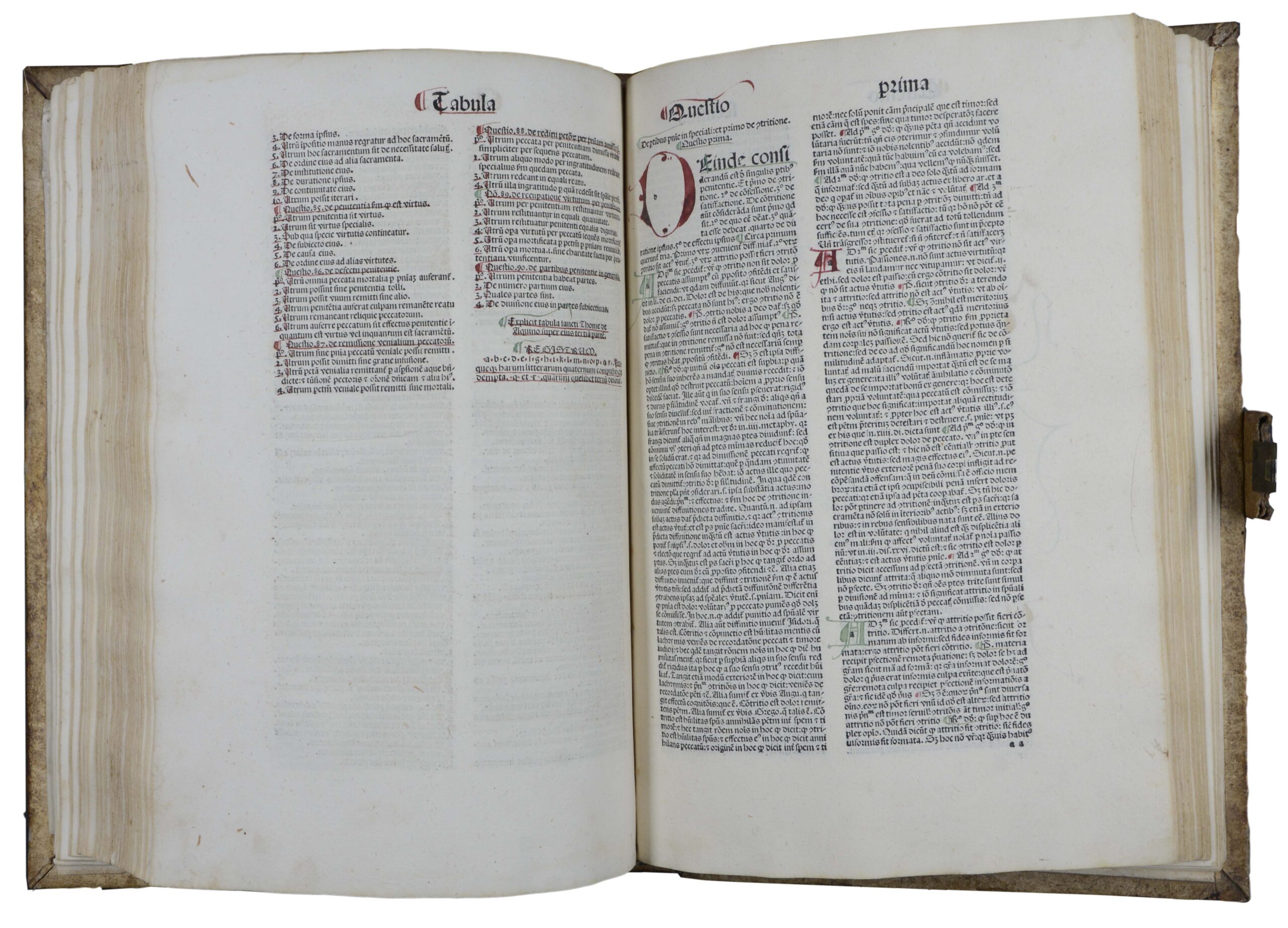 INKUNABEL – THOMAS VON AQUIN. Summa theologiae. Summa theologiae. Pars tertia cum additionibus. Venedig, B.Stagninus de Tridino, 10. April 1486. Folio. 228 (von 230) Bl., fehlende Blatt in zeitgenössischer Handschrift auf 4 Blatt beigebunden, dadurch 232 Bl. Blindgeprägtes Schweinsleder der Zeit über Holzdeckeln mit intakter Schließe, (minimal fleckig).