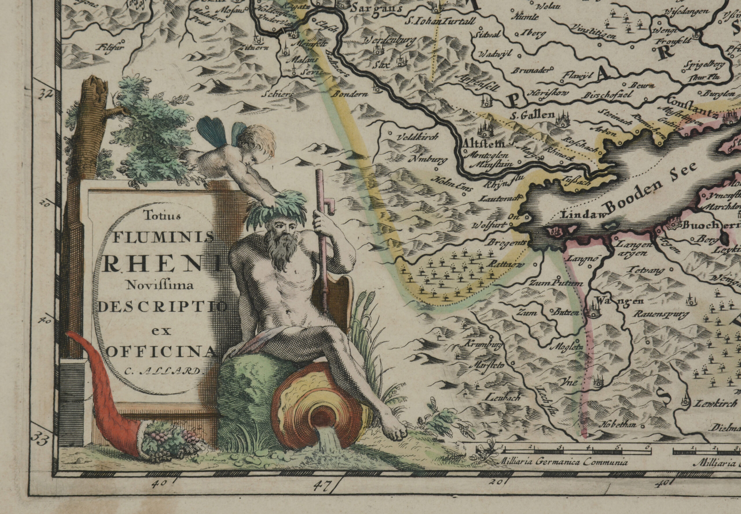 Seltene Rheinlaufkarte. – Mit einer schönen figürlichen altkolorierten Kartusche, den Flussgott „Vater Rhein“ darstellend. – Leicht angestaubt.