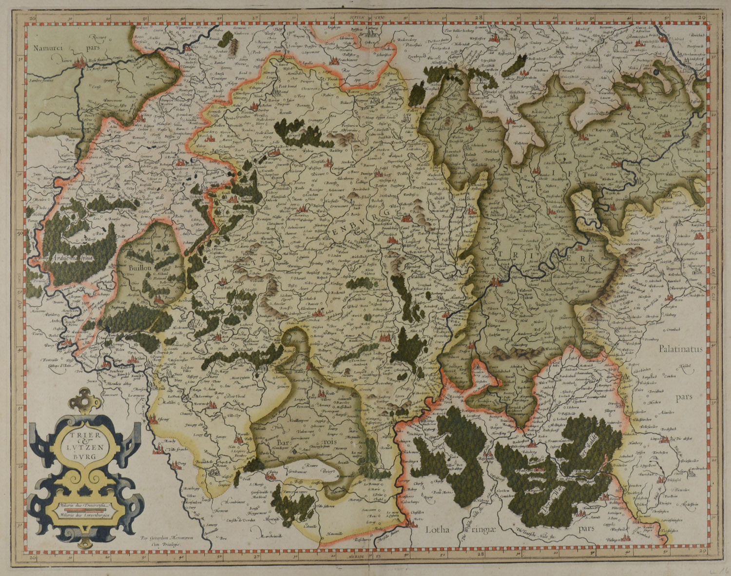 Per Gerardum Mercatorem. Cum Privilegio. Die Karte erstreckt sich im Norden von Limburg nach Metz und im Westen von Fumey bis Simmern. Kräftige Kolorierung.