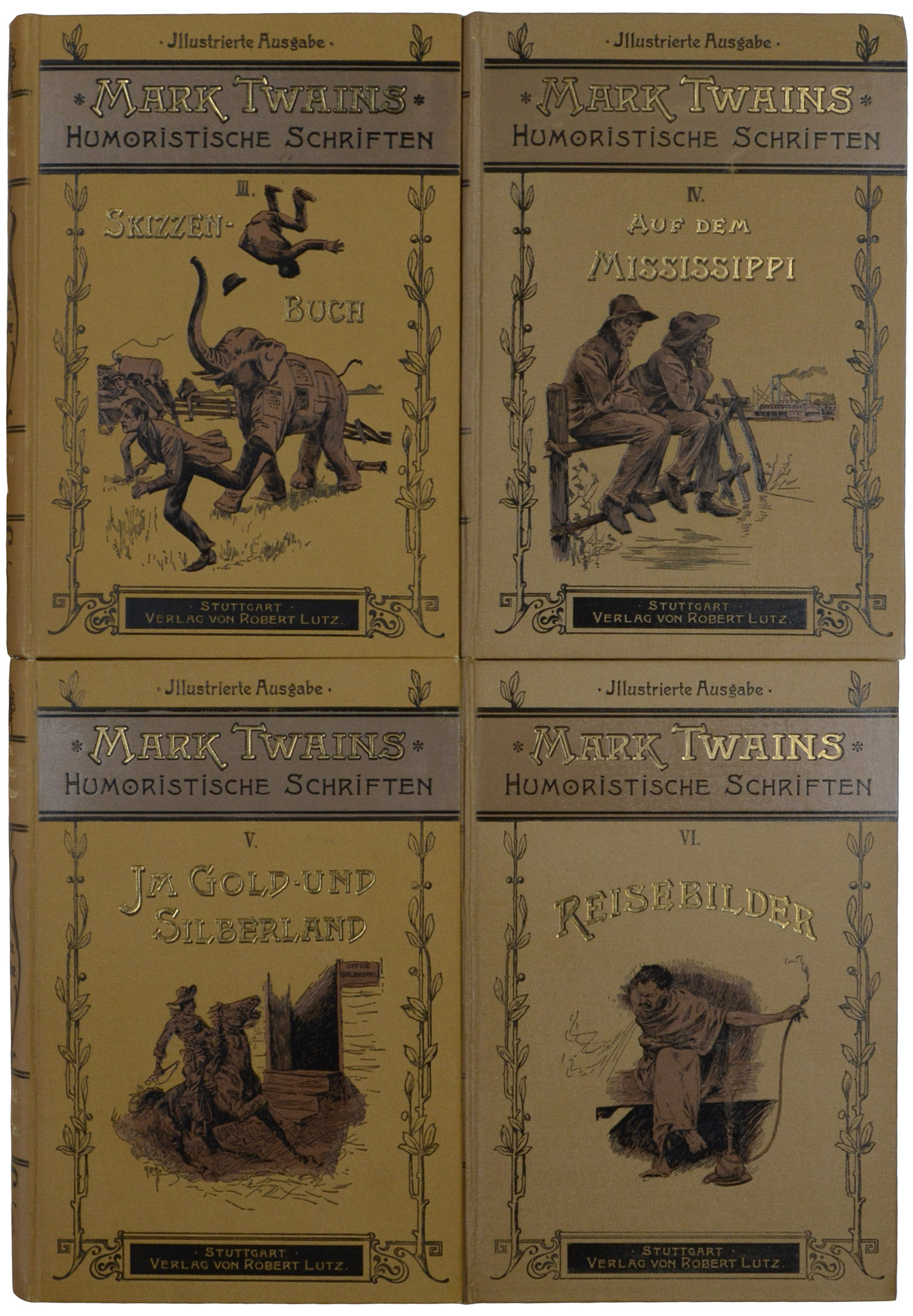 TWAIN, Mark. Ausgewählte humoristische Schriften. Stuttgart, Robert Lutz, 1898-1907. 6 Bände. 8. Mit einem Porträt und zahlreichen Illustrationen von H.Schrödter. Illustriertes Originalleinen, (minimal beschabt, 2 Bände leicht farblich abweichend).