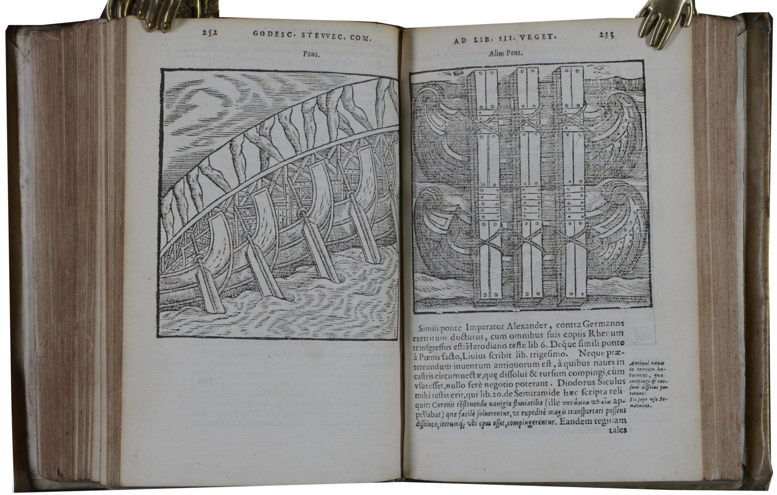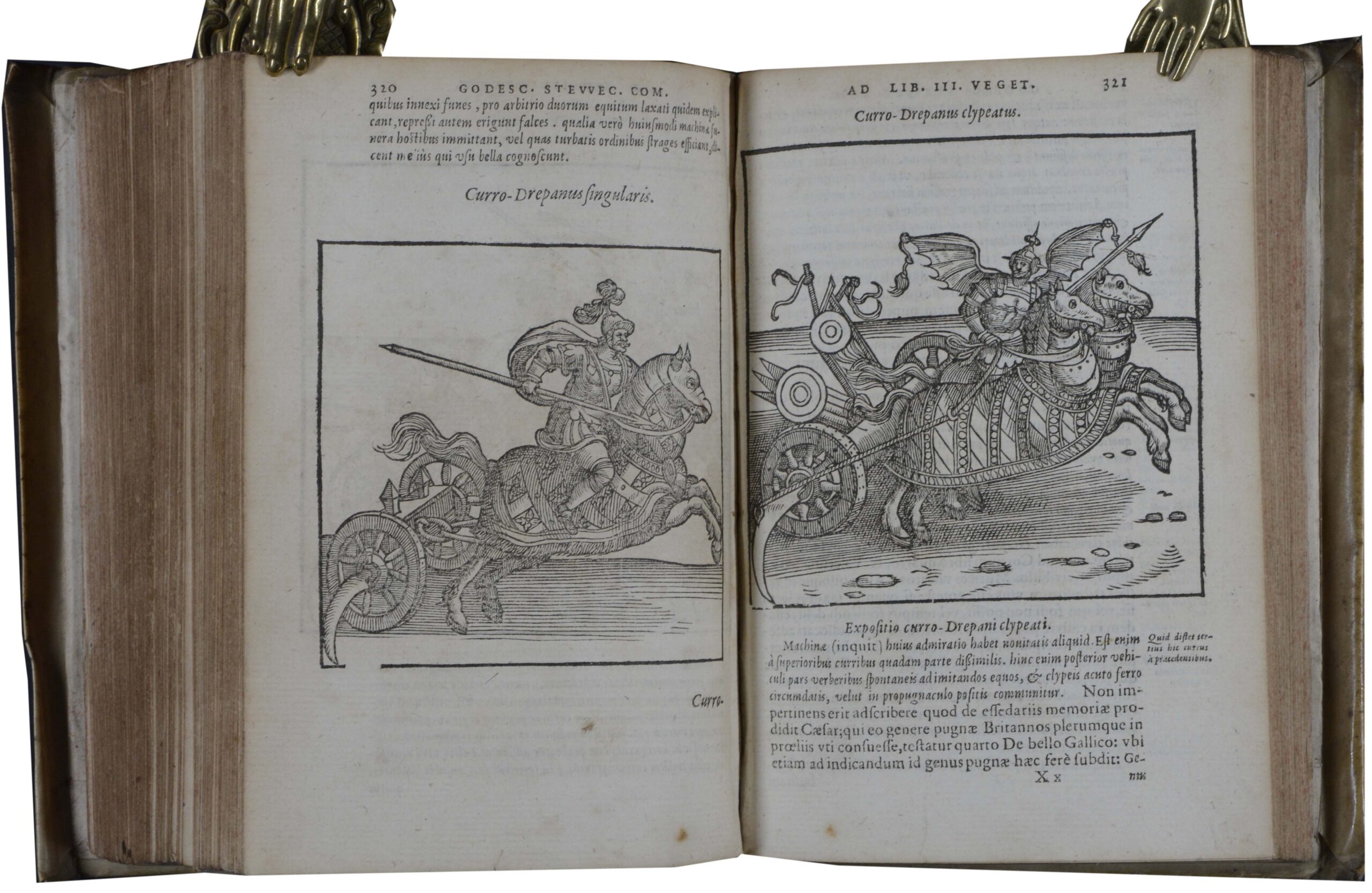 Zweite Ausgabe der von G. Stewech kommentierten Plantin-Edition, die erste Ausgabe bei Plantin erschien 1585. – Adams V 337; Voet 2419 A, Anm 8; BM STC, Dutch 204. – Der erste Teil enthält das für die damalige Zeit wichtige römische Kriegshandbuch mit den Schriften von Vegetius, Julius Fontinus, Aelianus Tacticus u.a., der zweite Teil Stewechs Kommentare mit den schönen Holzschnitten. Diese zeigen Uniformen, Schutzschilde, Maschinen zur Belagerung, Ausrüstungen für Pferde und Reiter, Kriegsschiffe, usw. – Minimal stockfleckig, Titel mit kleiner Fehlstelle im Papier ohne Buchstabenverlust, Innengelenke unauffällig verstärkt, Ex-Libris (Heinrich und Else von Traitteur) auf Innendeckel. Schönes Exemplar.