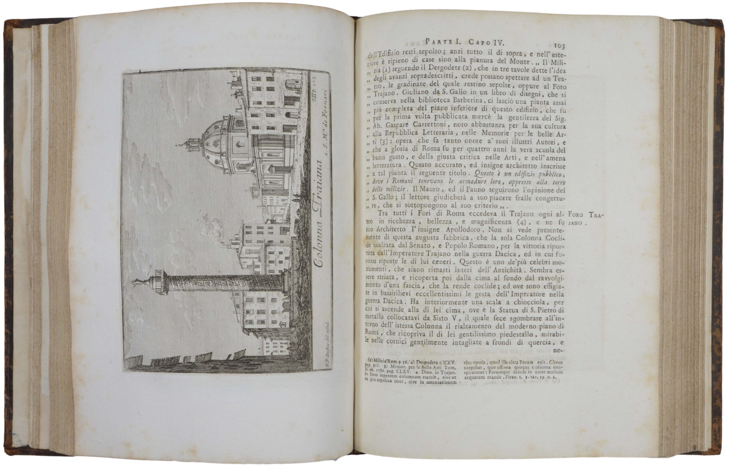 Zweite Ausgabe des berühmten illustrierten Romführers. – Vgl. Ornamentstichslg. 1891, Hind S. 88. – Hauptwerk des bedeutenden Kunsthistorikers und Archäologen Ridolfino Venuti (1705-1763) – Die Tafeln mit zahlreichen Ansichten von Piranesi, Duflos, Le Geay, Bellicard u. a. Gegenüber der ersten Auflage mit weniger Kupfertafeln ausgestattet. – Ohne die schematische Tafel nach S. 12. – Leicht stockfleckig, Ex-Libris (James Whatman) auf Innendeckel.