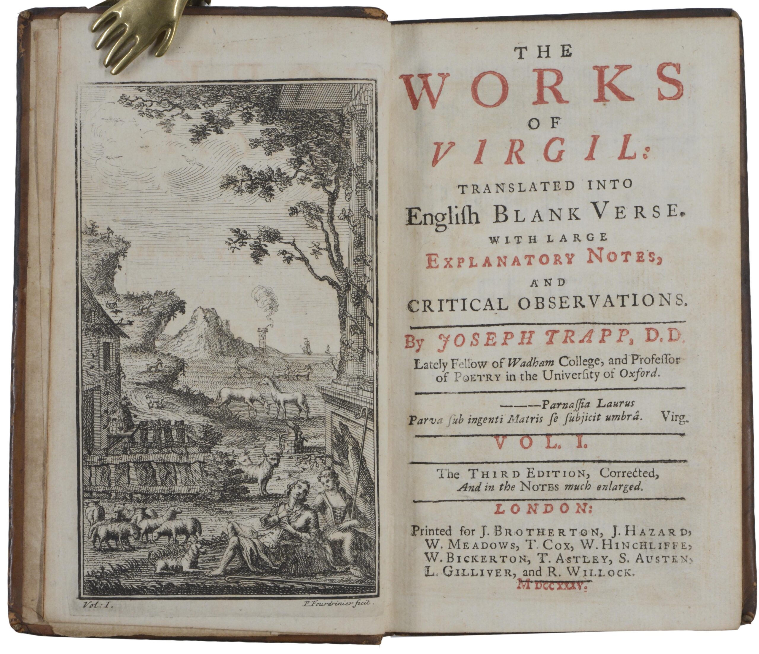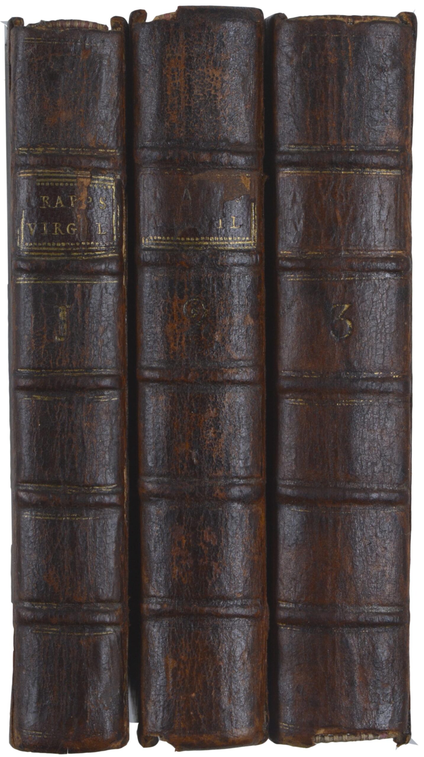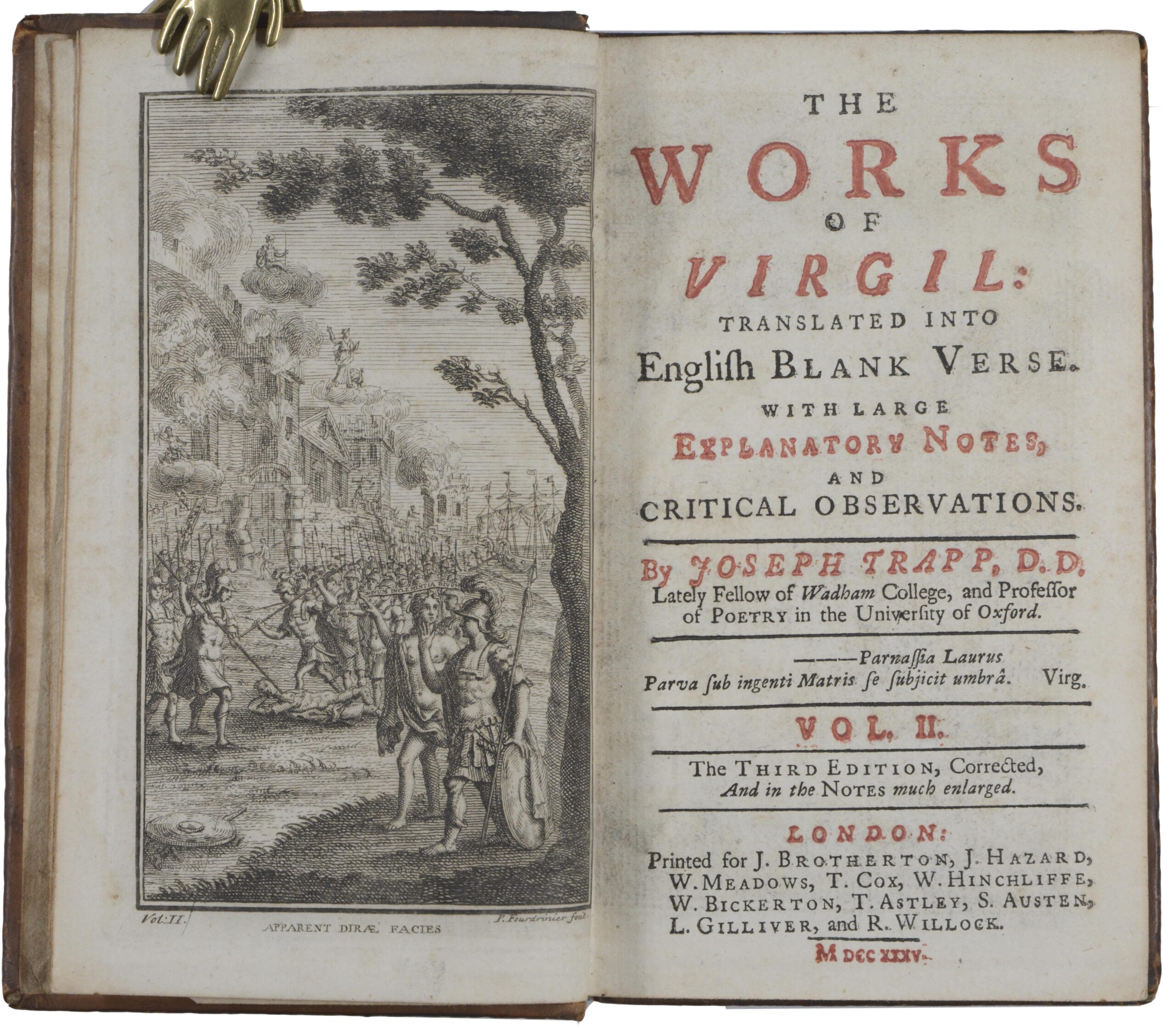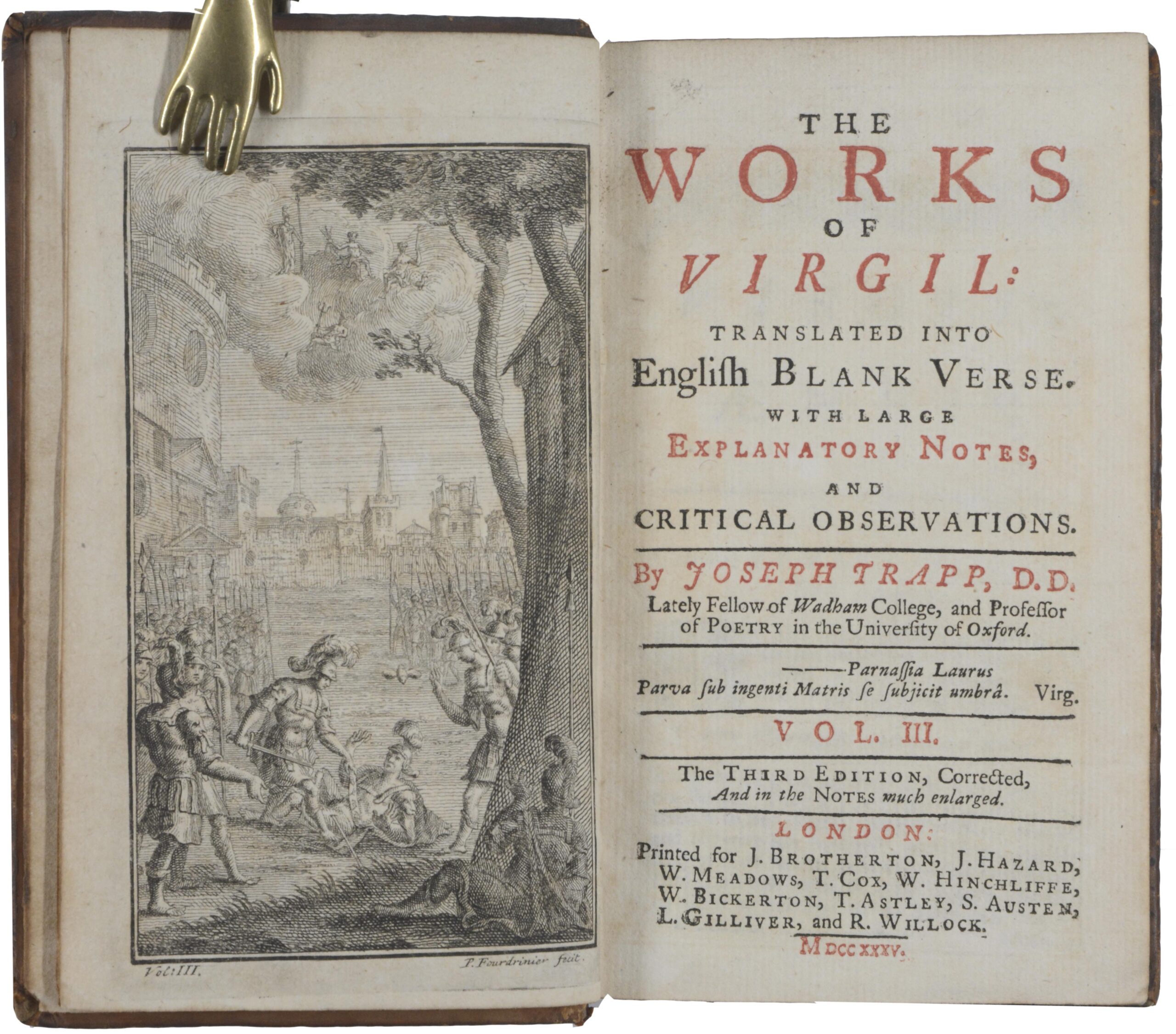 VERGILIUS MARO – VIRGIL. The Works. Translated into English blank verse. With explanatory notes, and critical observations by Joseph Trapp. London, Brotherton, Hazard, etc. 1735. Third edition, corrected, and in the notes much enlarged. 3 Bände. 8°. Mit 4 gestochenen Frontispizen. Leder der Zeit mit Deckelfileten, (berieben und bestoßen, Rückenschilder fehlen teils).