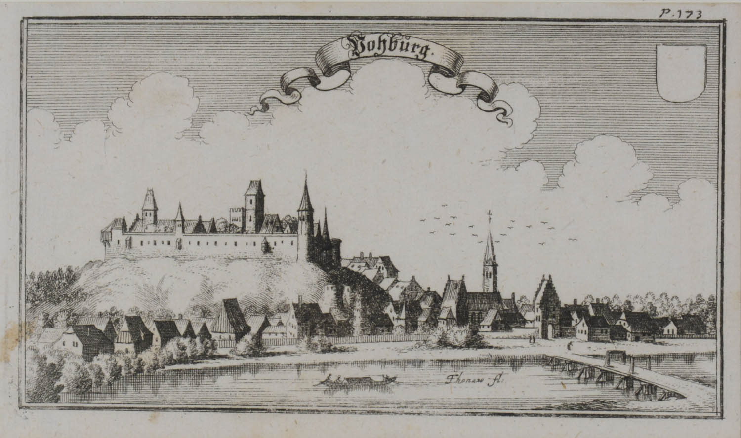 VOHBURG. Gesamtansicht. 1687. Kupferstich aus Ertl, 8×14,3.