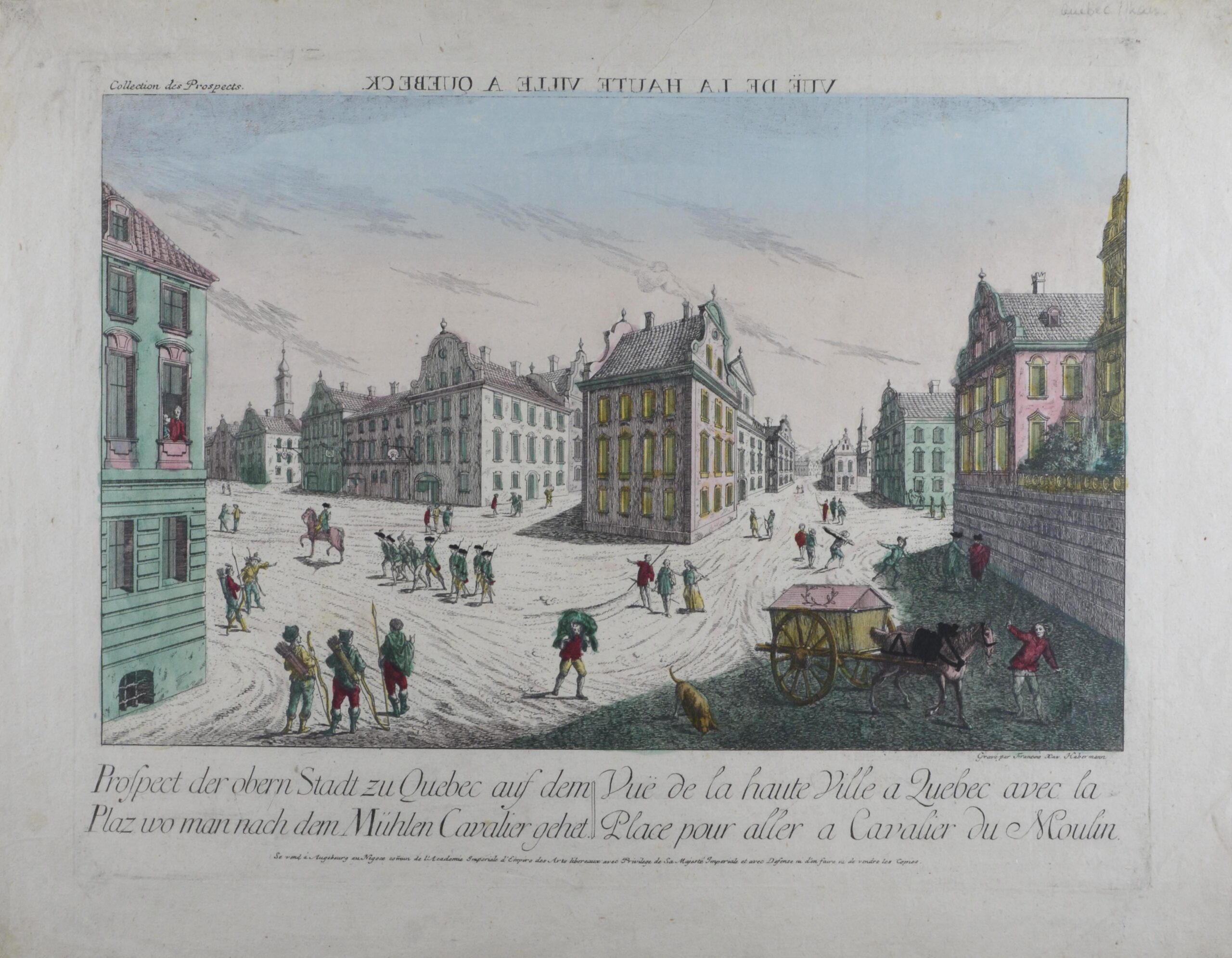 QUEBEC/GUCKKASTENBLATT – Vue de la haute Ville à Quebeck. Prospect der obern Stadt zu Quebec auf dem Plaz wo man nach dem Mühlen Cavalier gehet. Seitenverkehrte Ansicht. Augsburg, Kaiserlich Franziskische Akademie, um 1780. Altkolorierter Guckkastenkupfer von François Xav. Habermann. 31,5 x 41 cm. Mit fast 3 cm breiten Rändern, diese stellenweise knittrig.