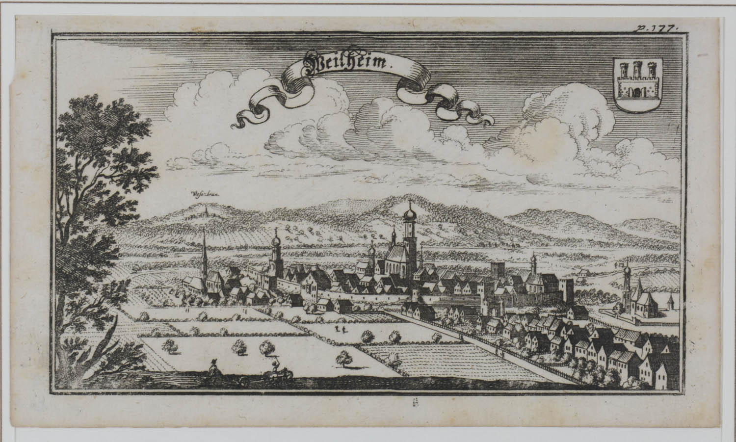 WEILHEIM. Gesamtansicht. 1687. Kupferstich aus Ertl, 8×14,3.