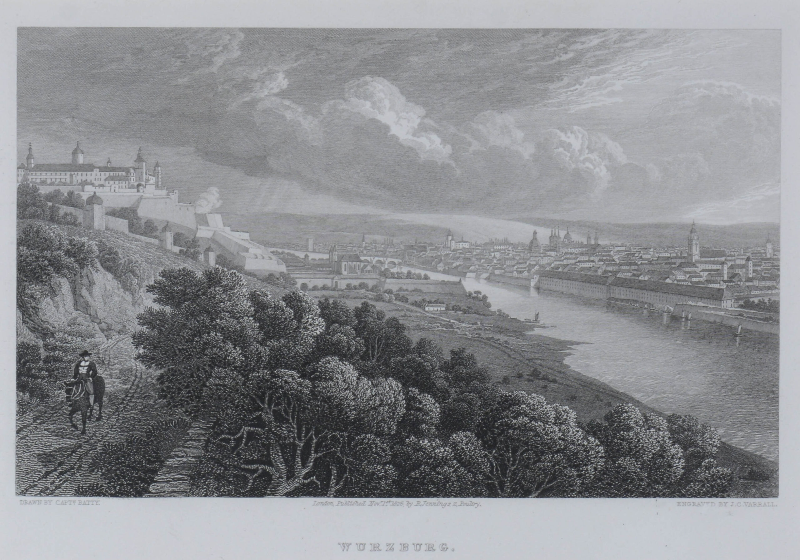 WÜRZBURG. Gesamtansicht über den Main und Festung Marienberg. London, 1825 Handkolorierter Stahlstich von Varrail nach Batty. 12,5×20,5.